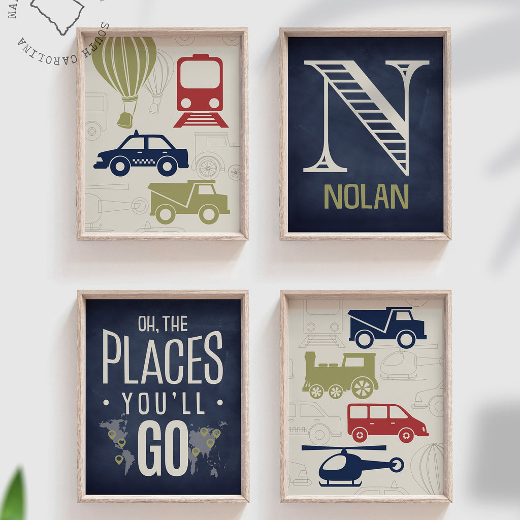 Transportation theme nursery, bedroom, or playroom, boys prints, boys decor, cars trucks train balloon, name print, oh the places you'll go
