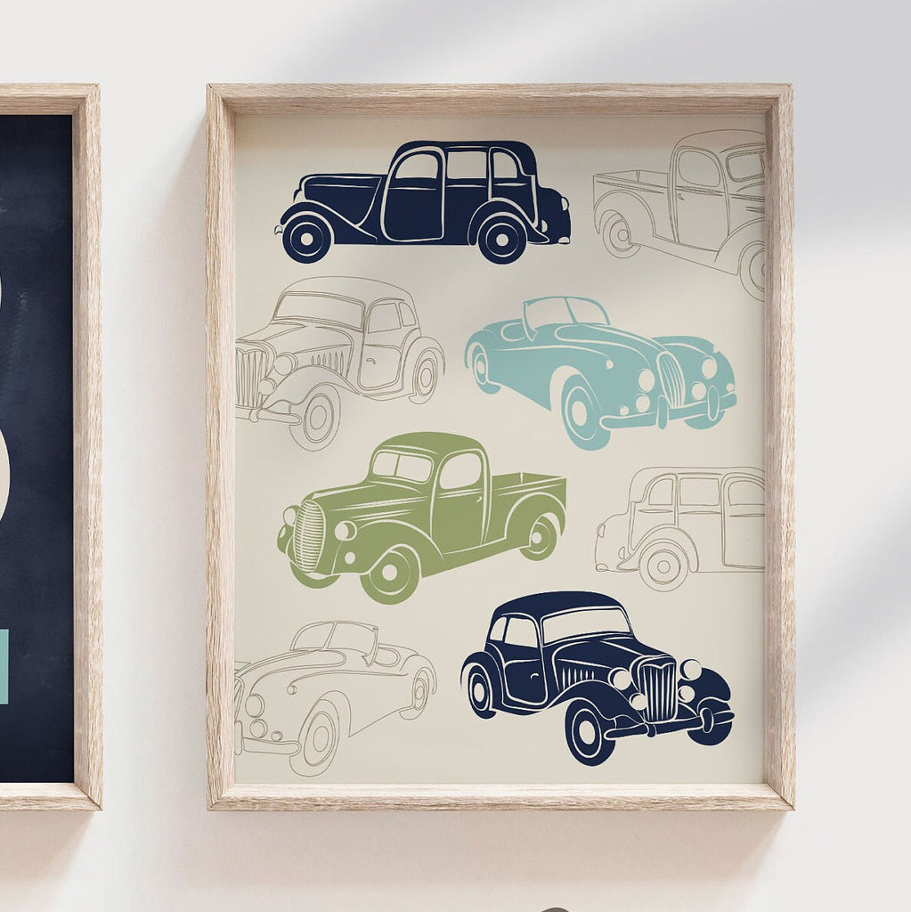 Product description: Retro car and truck theme prints in navy blue, clover and rustic teal with a matching personalized name print. Background of the name print has a "chalkboard look." Other color options are also available in my shop.