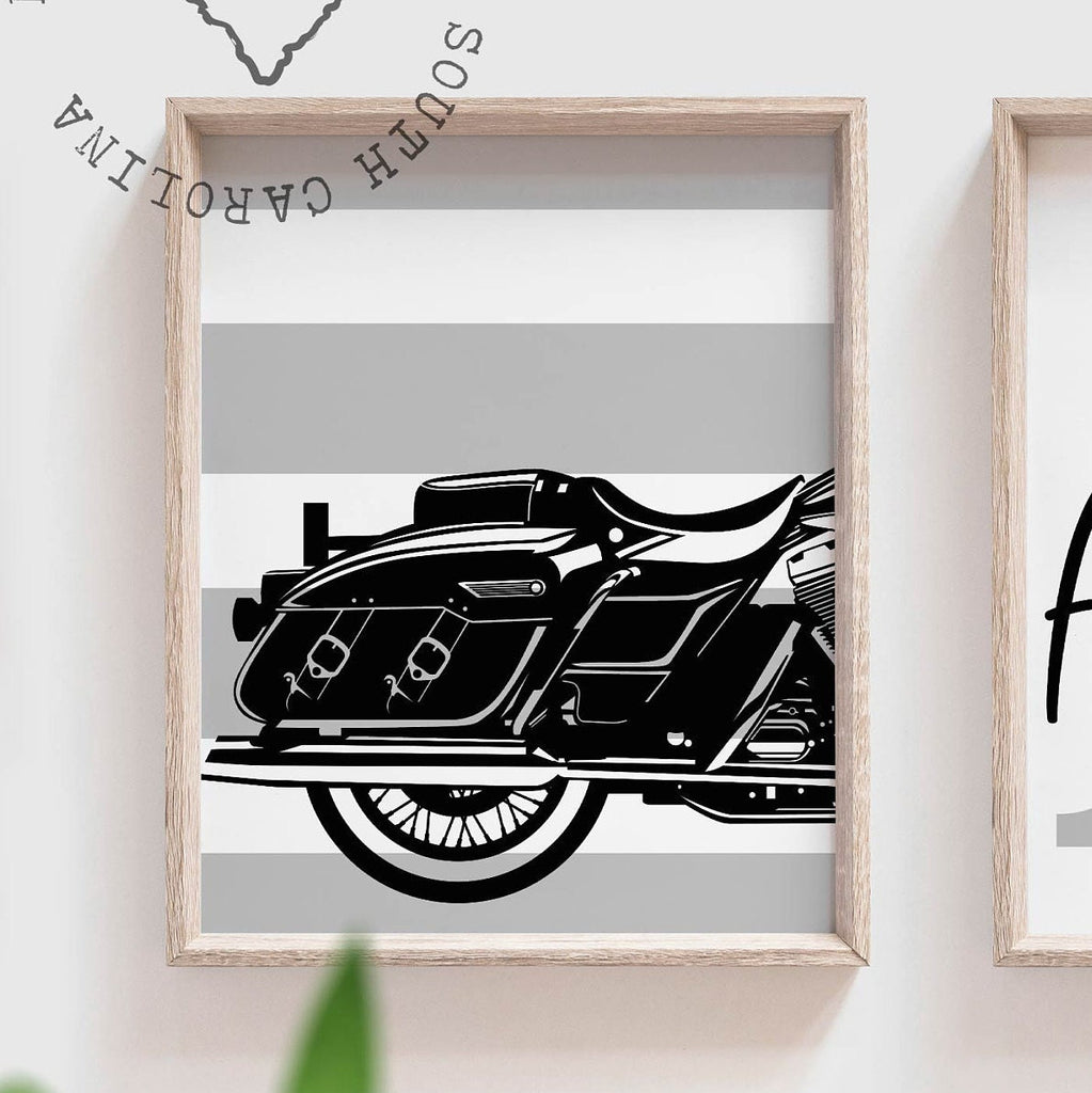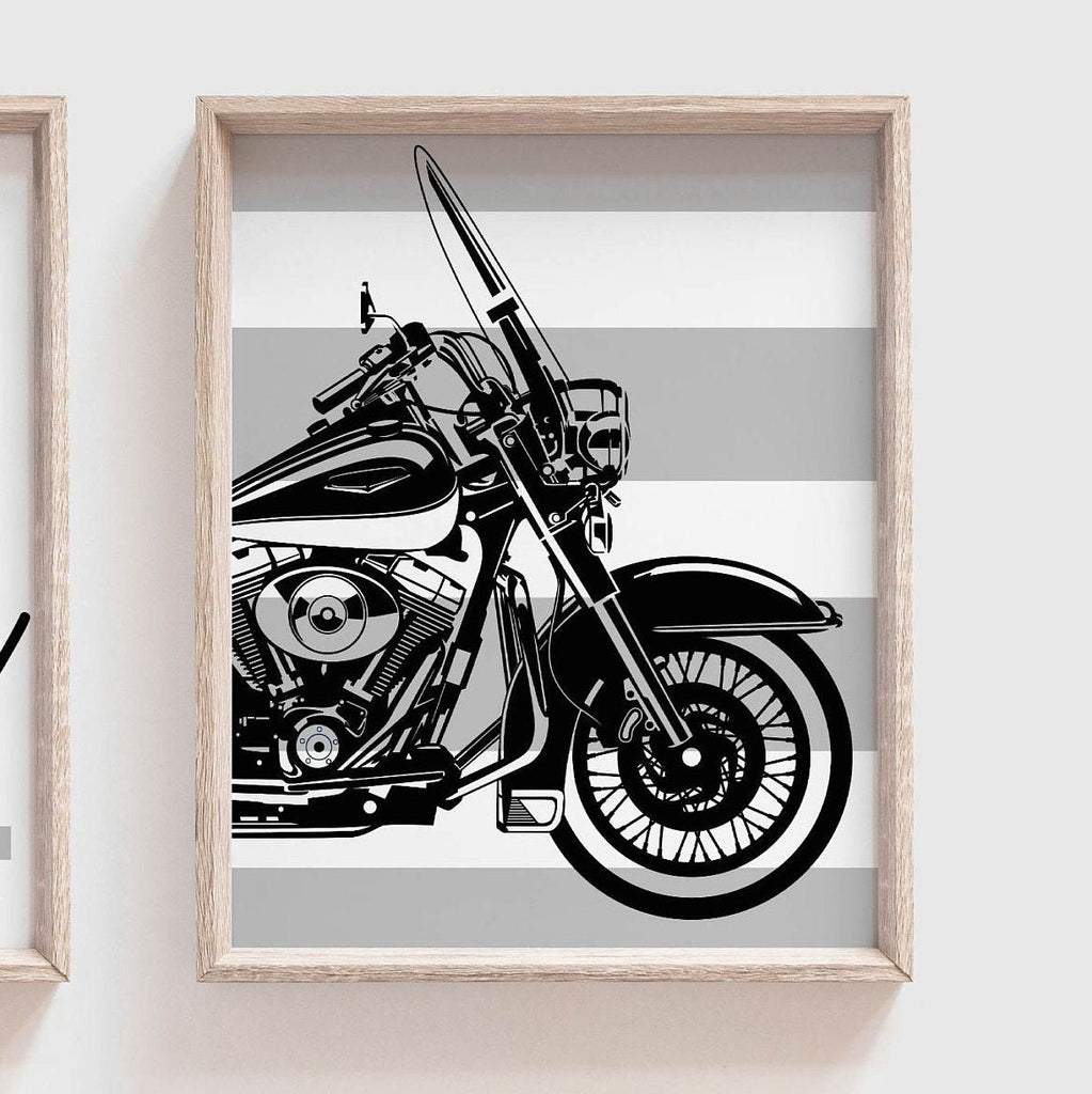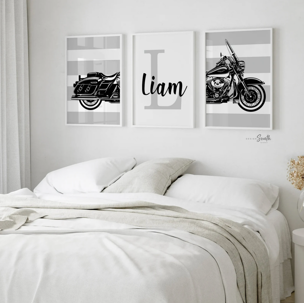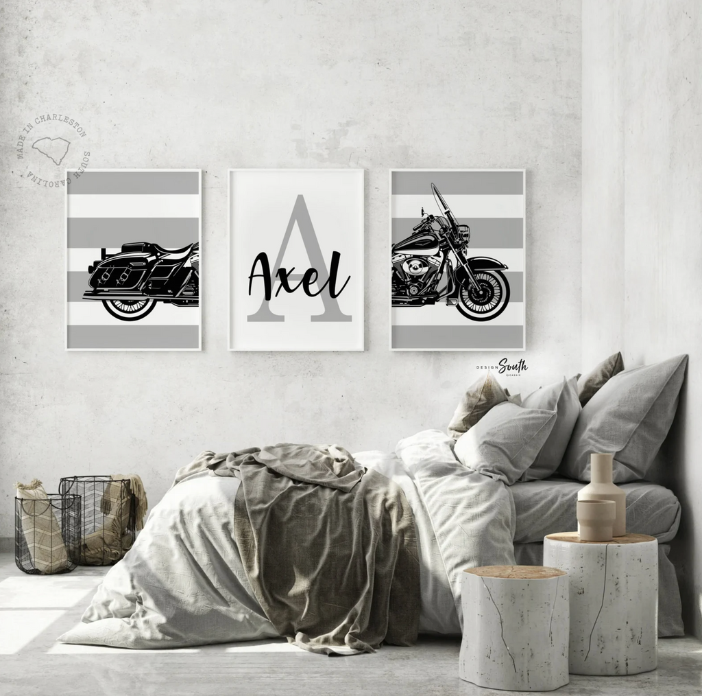 Product description: Motorcycle theme prints featuring a Road King Harley Davidson in black and smoke gray with thick striped backgrounds. Matching personalized name print to be customized with your child's name and initial. Other color options are also available in my shop.