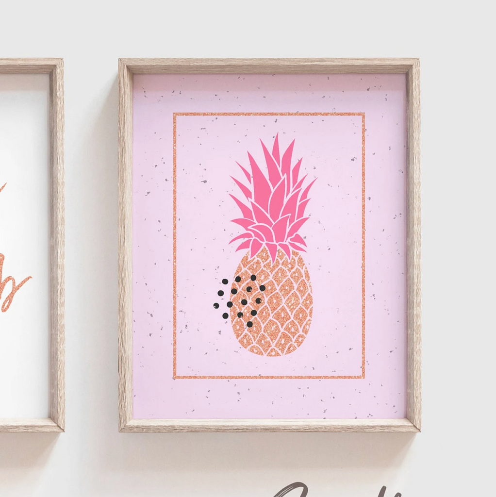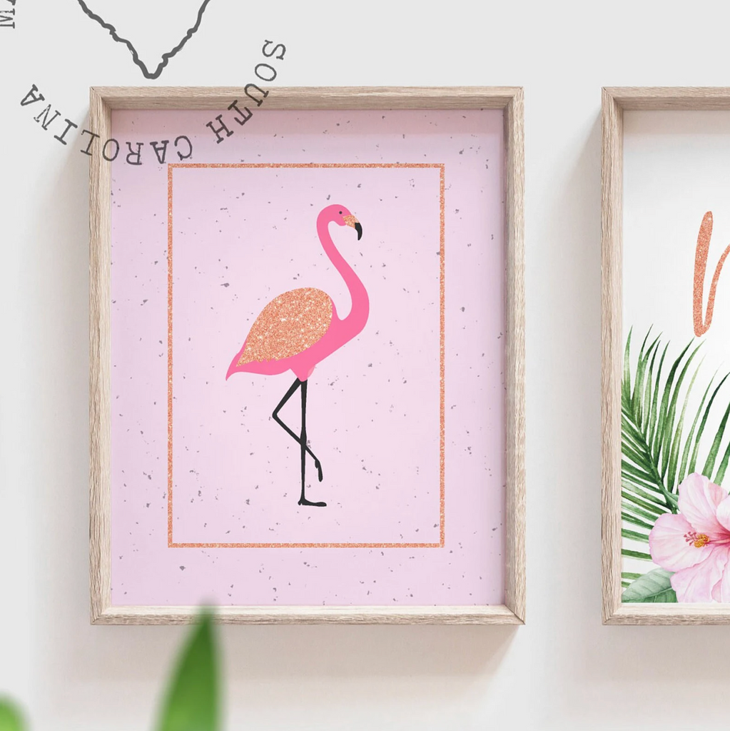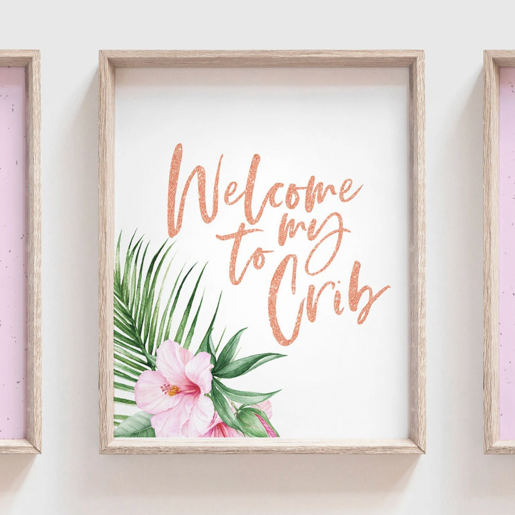 Product description: Tropical art set featuring a glittery flamingo and pineapple in bubblegum and gold with matching center print reading, "Welcome to my crib" accented with a tropical flower. Other options are also available in my shop.