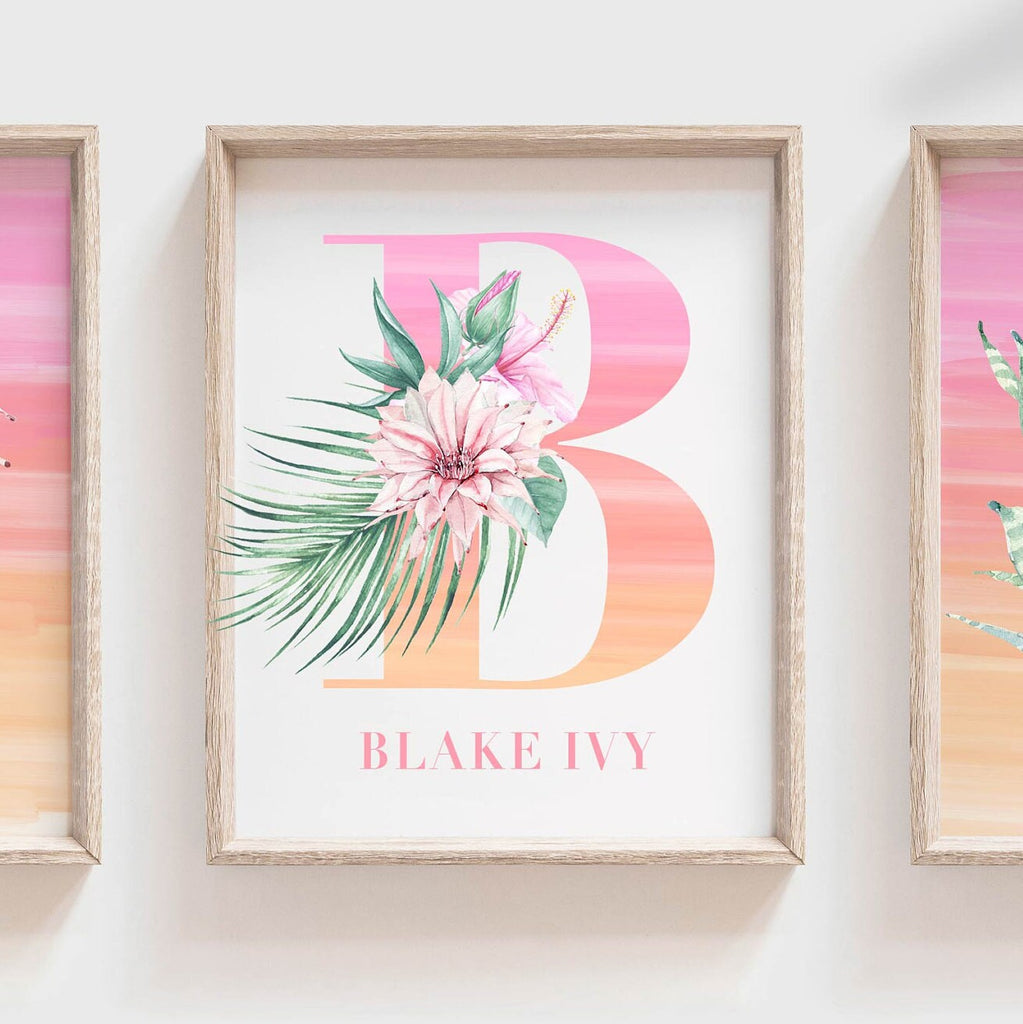 Pink orange tropical girl room art pictures, toddler girl room wall art, pink tropical desert nursery art, bedroom girl name initial art set