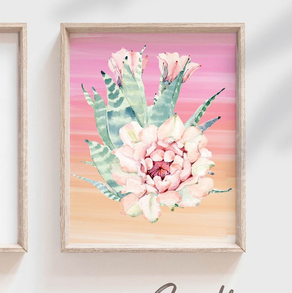 Product description: Watercolor bloomed cactus prints with pink & orange gradient watercolor backgrounds and matching monogram print to be customized with your child's name and initial. Other options are also available in my shop.