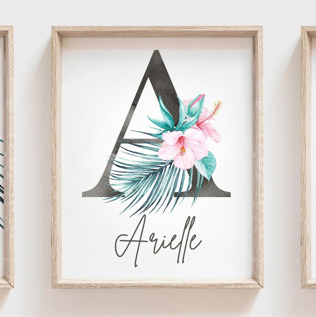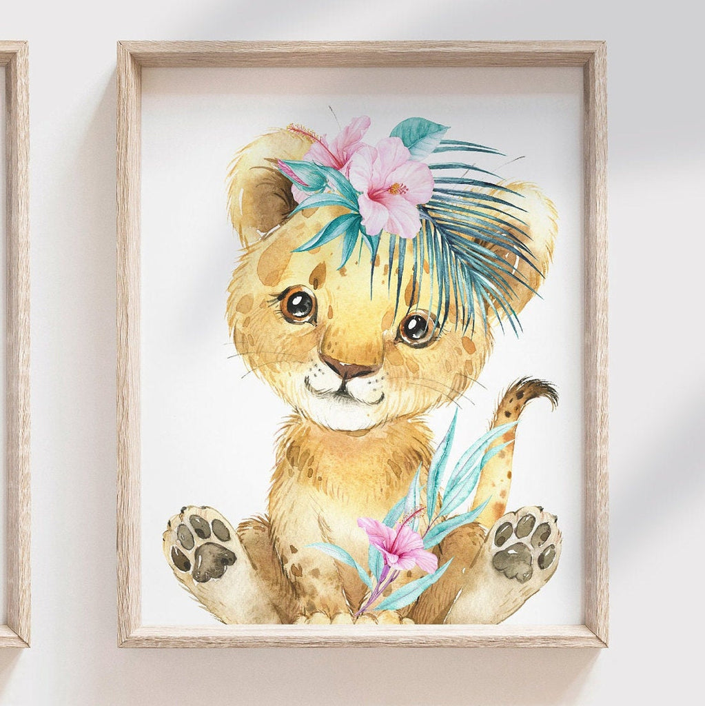 Product description: Tropical theme watercolor prints featuring a baby lion cub, hawaiian flowers, palm leaves and matching monogram print to be customized with your child's name and initial. Other options are also available in my shop.