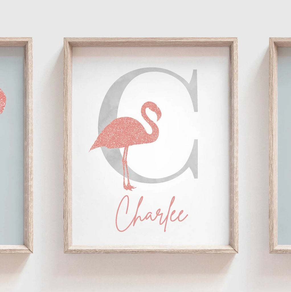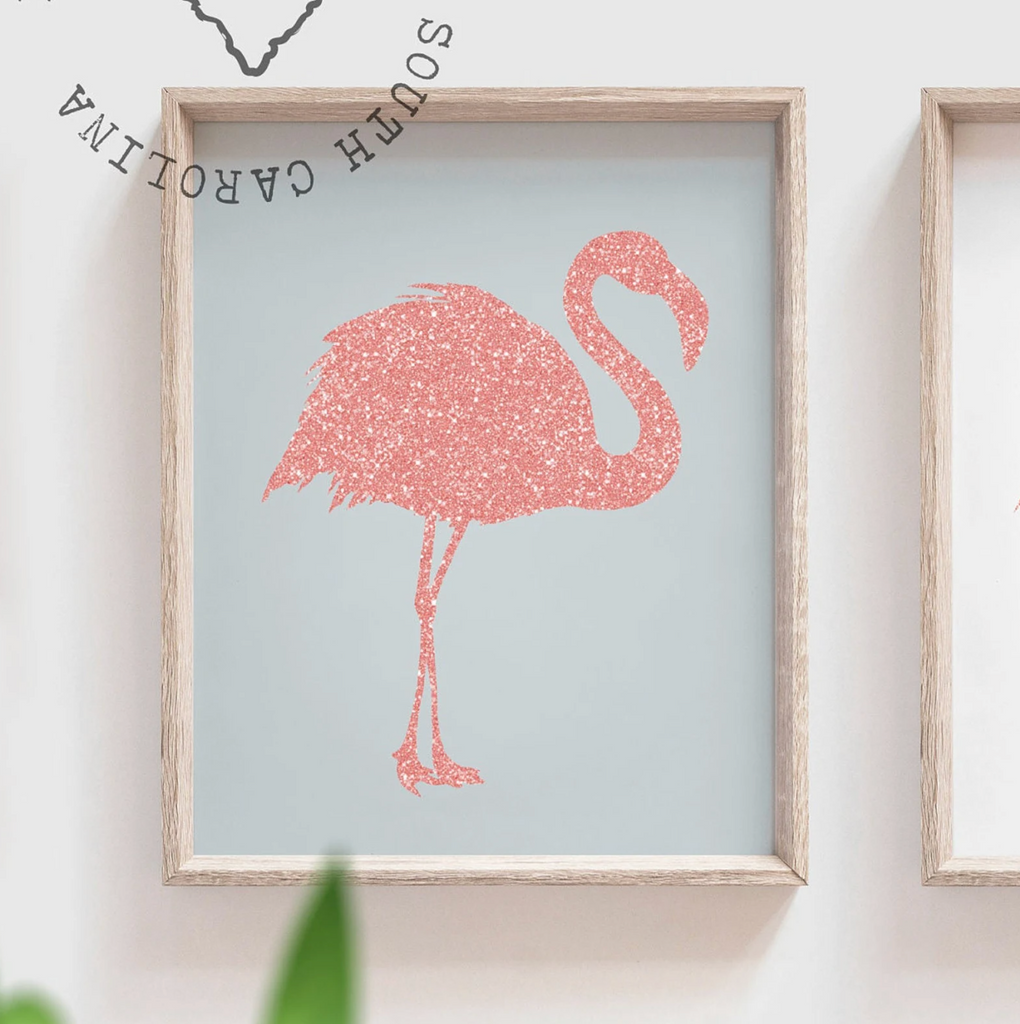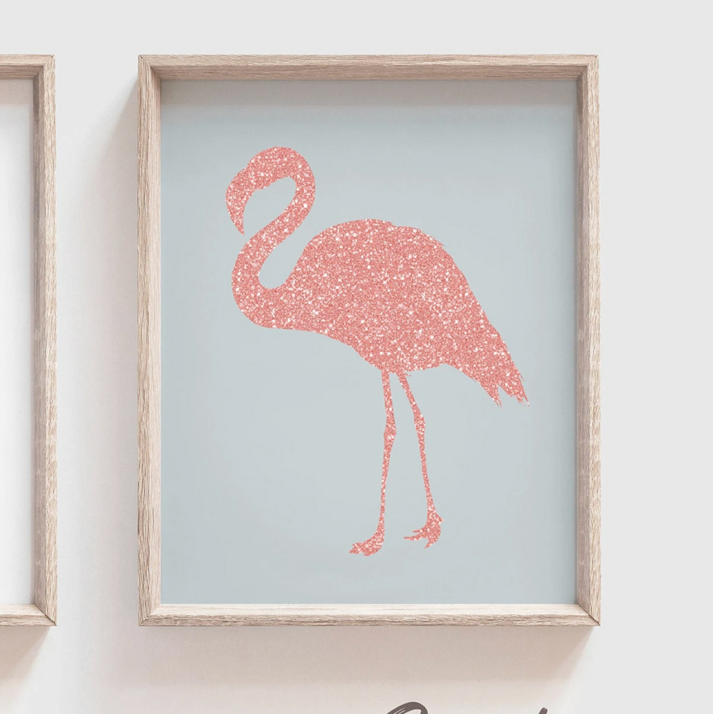 Sparkle rose gold glitter flamingo art, tropical prints rose gold, girl's pink glittery art, girl room decor pink glitter, personalized pink gray