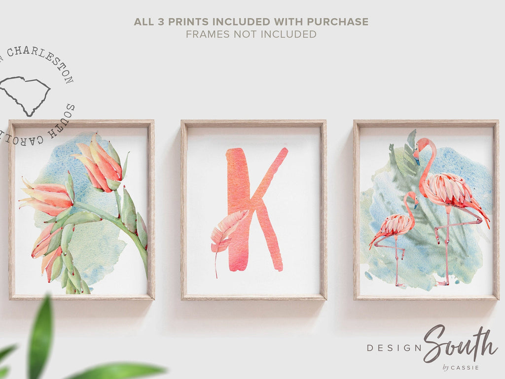 Product description: Tropical jungle theme prints featuring flamingos, bloomed tropical flowers and a monogram accented with a flamingo feather to be customized with your child's initial. Alternative option features an initial, first and middle name. Other options are also available in my shop.