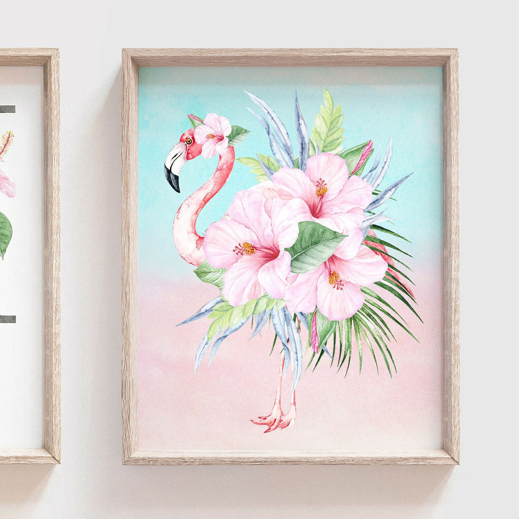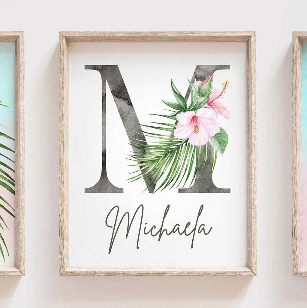 Product description: Tropical watercolor prints featuring a palm leaves with blooming flowers, a decorated flamingo and monogram print to be customized with your child's name and initial. Other options are also available in my shop.