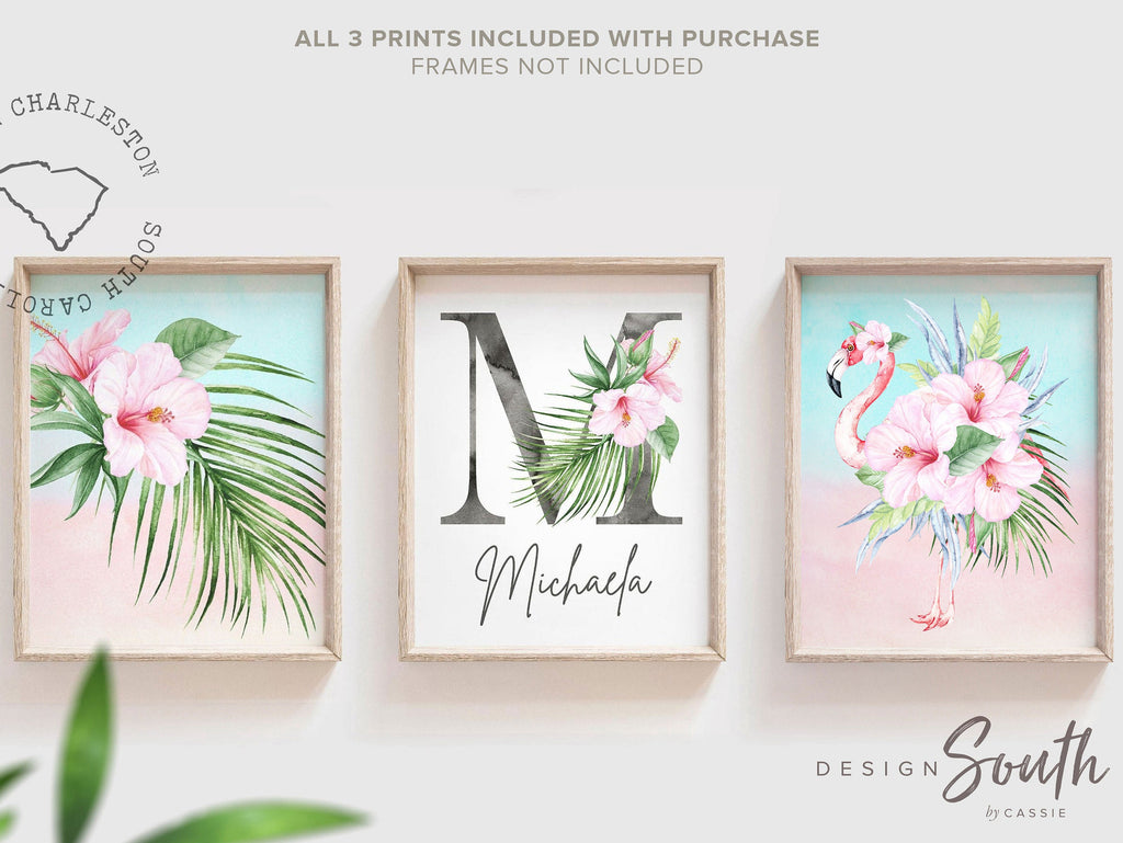 Tropical girl nursery, flamingo baby room decor, personalized monogram tropical flamingo, wall art set tropical newborn, baby shower gift