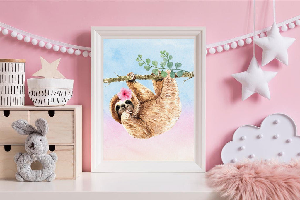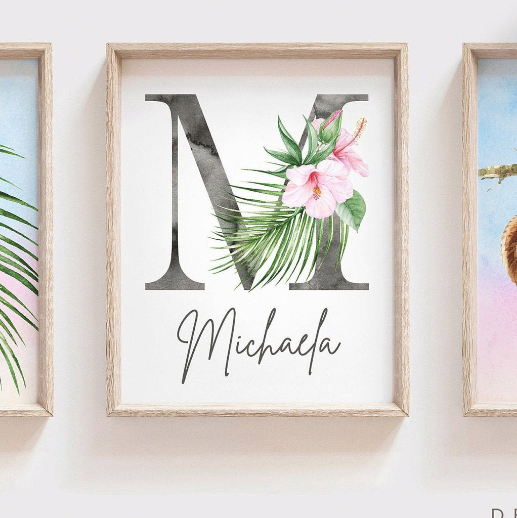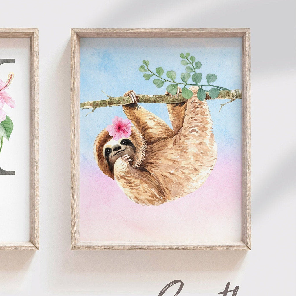 Product description: Tropical theme watercolor prints featuring a sloth, hawaiian flowers, palm leaves and matching monogram print to be customized with your child's name and initial. Other options are also available in my shop.
