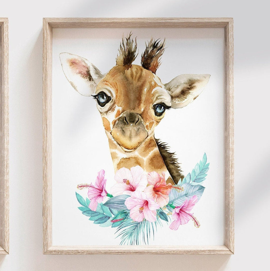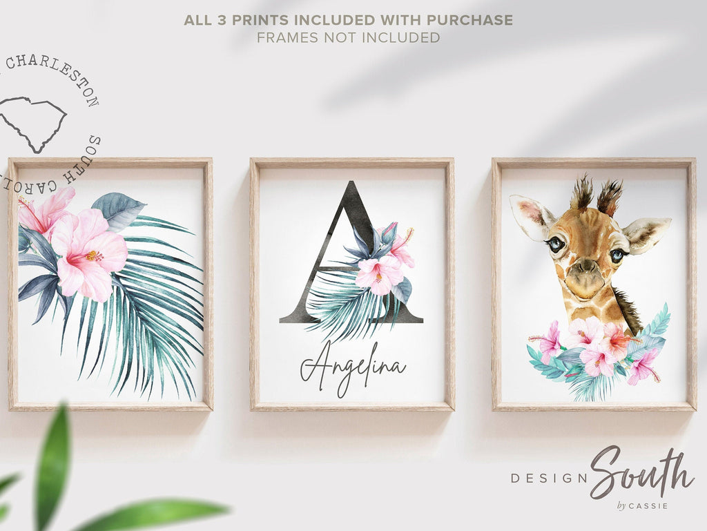 Product description: Tropical theme watercolor prints featuring a hawaiian flowers, a giraffe, palm leaves and matching monogram print to be customized with your child's name and initial. Other options are also available in my shop.