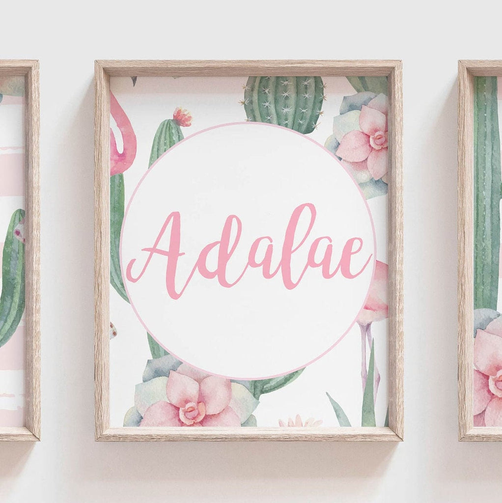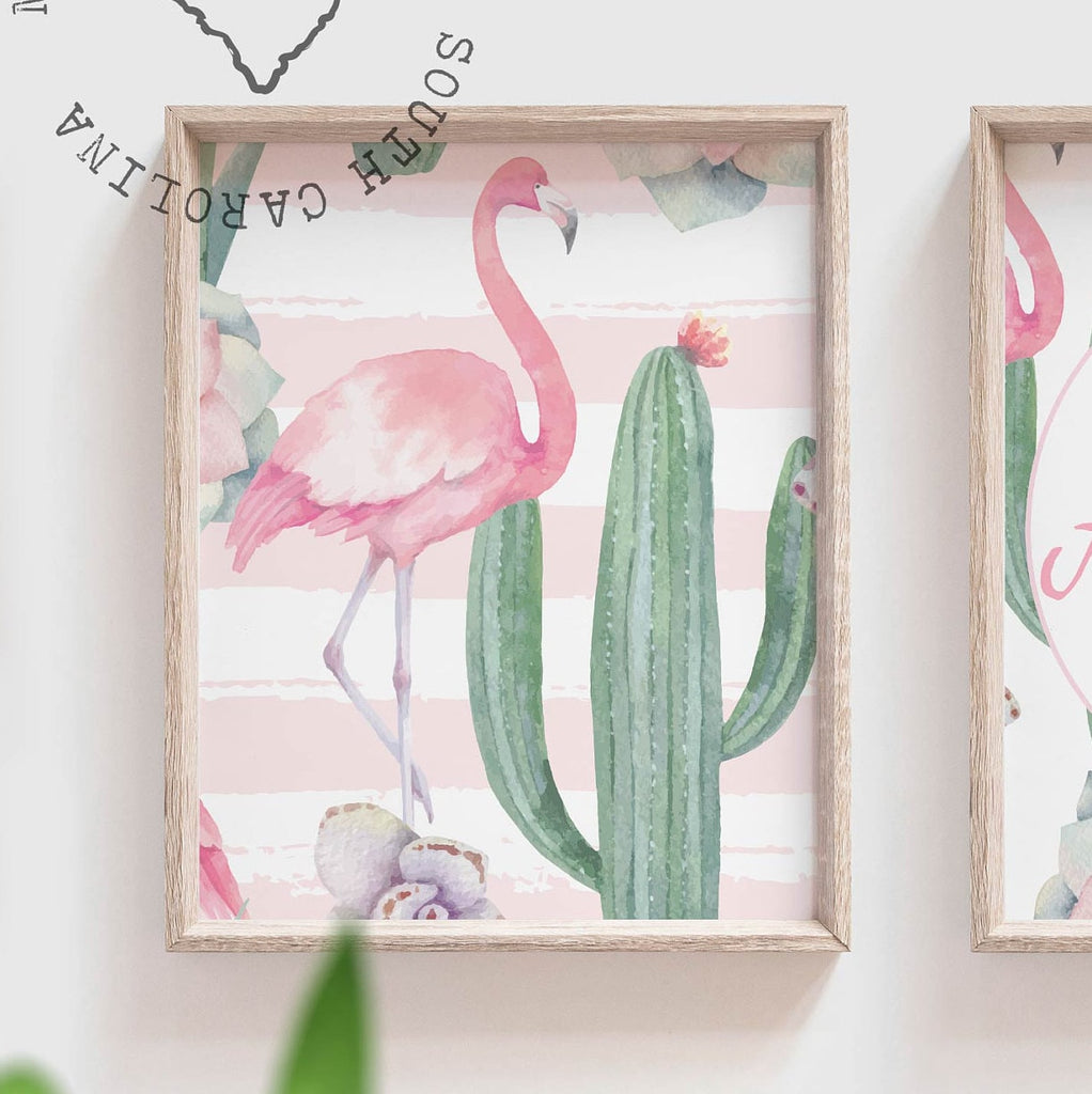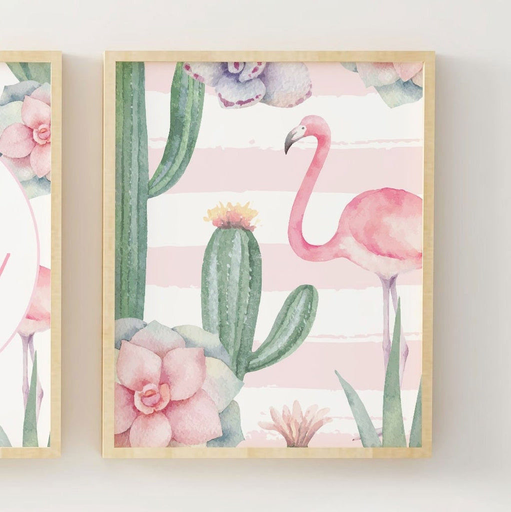 Tropical nursery, pink flamingo nursery cactus tropical flowers, green tropical leaves nursery, flamingo cactus, personalized baby girl gift