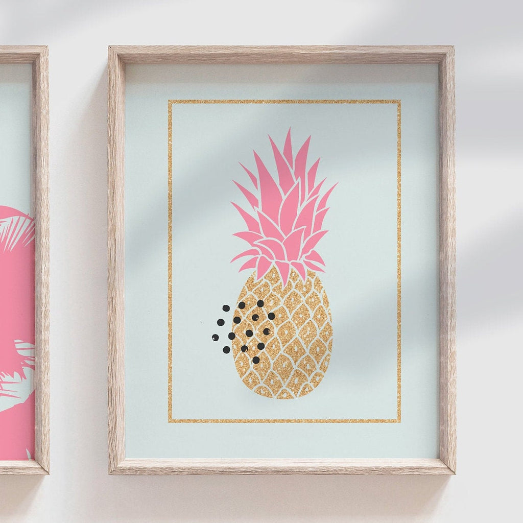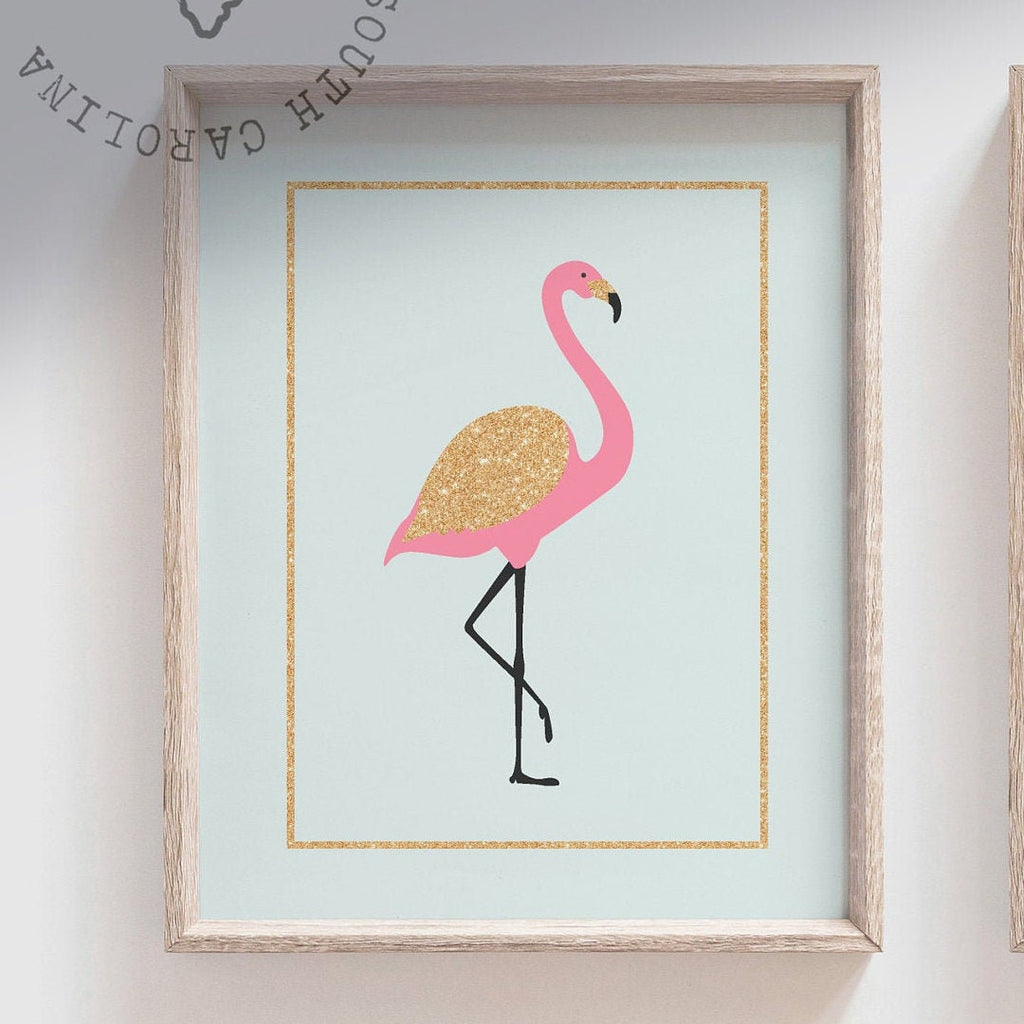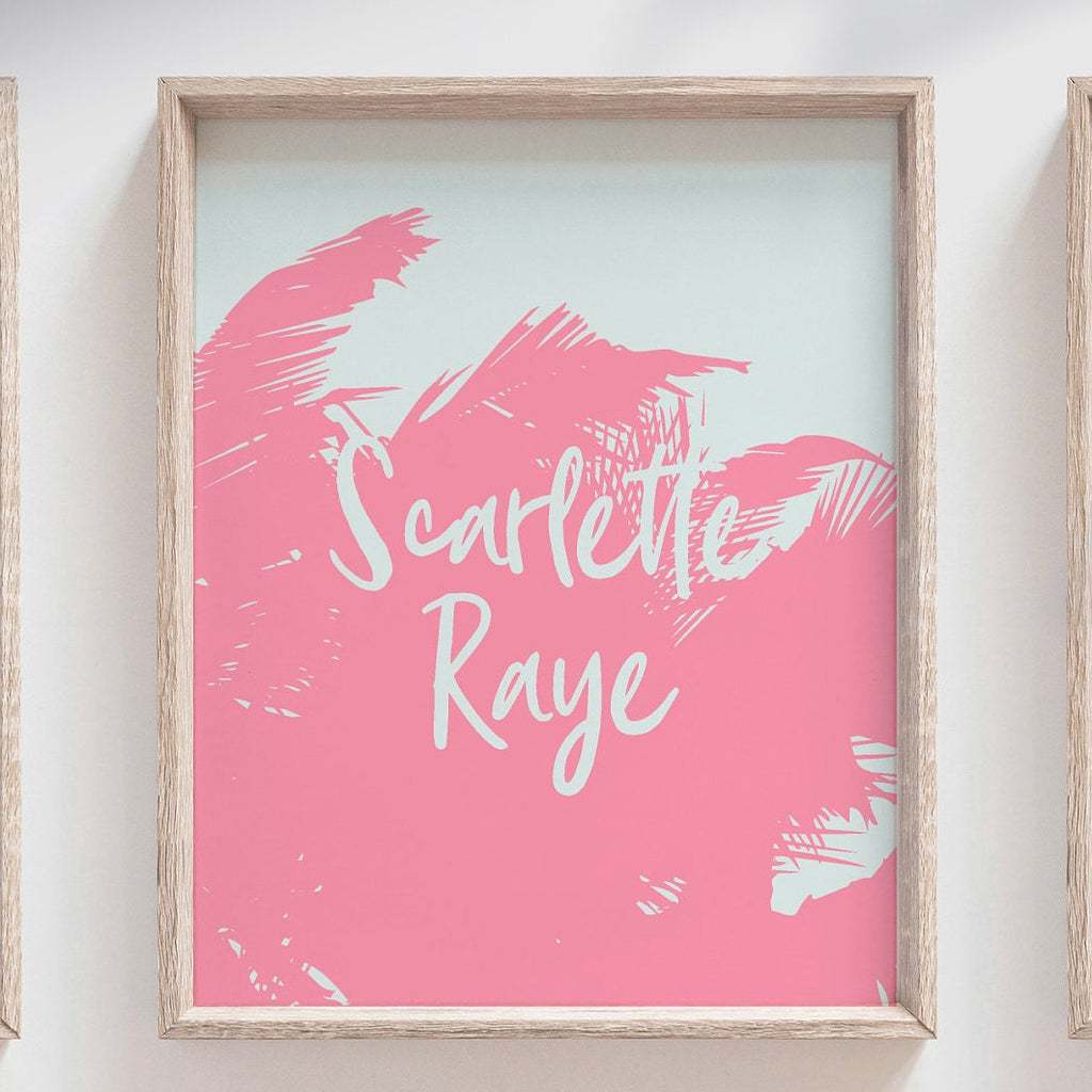 Tropical nursery theme, pink aqua nursery, pink palm trees flamingos gold sparkles, girl's name pink aqua gold baby room wall art tropical