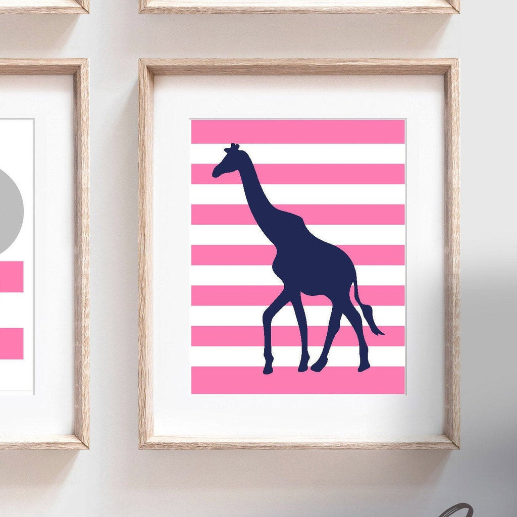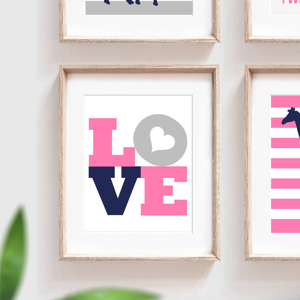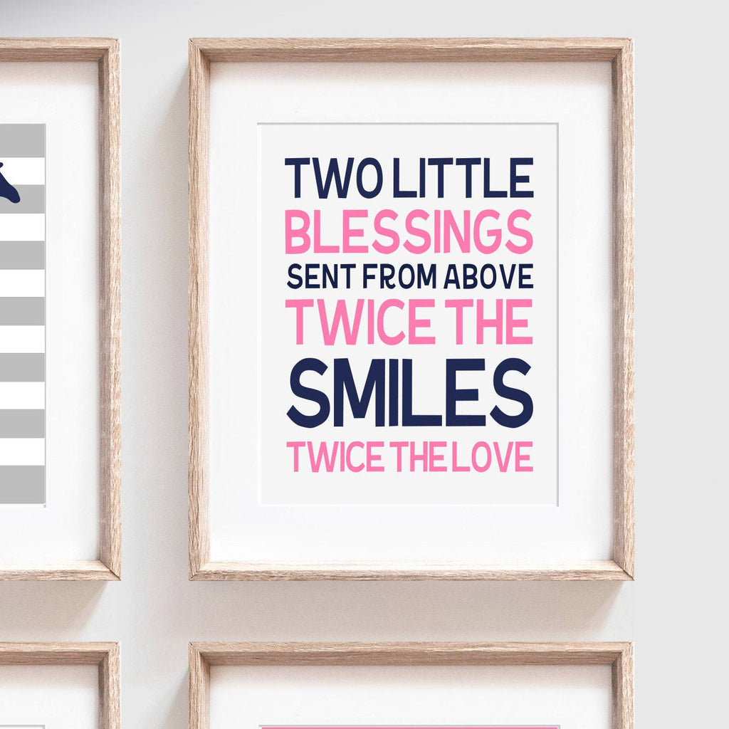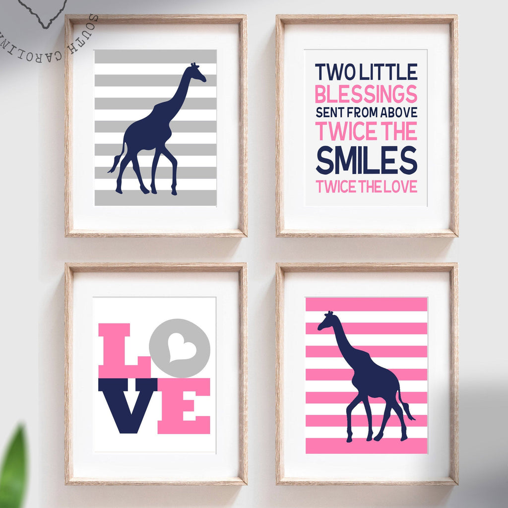 Twin nursery art with giraffes, twins nursery prints, twins baby wall art pink gray, twin prints for bedroom, two little blessings twin wall