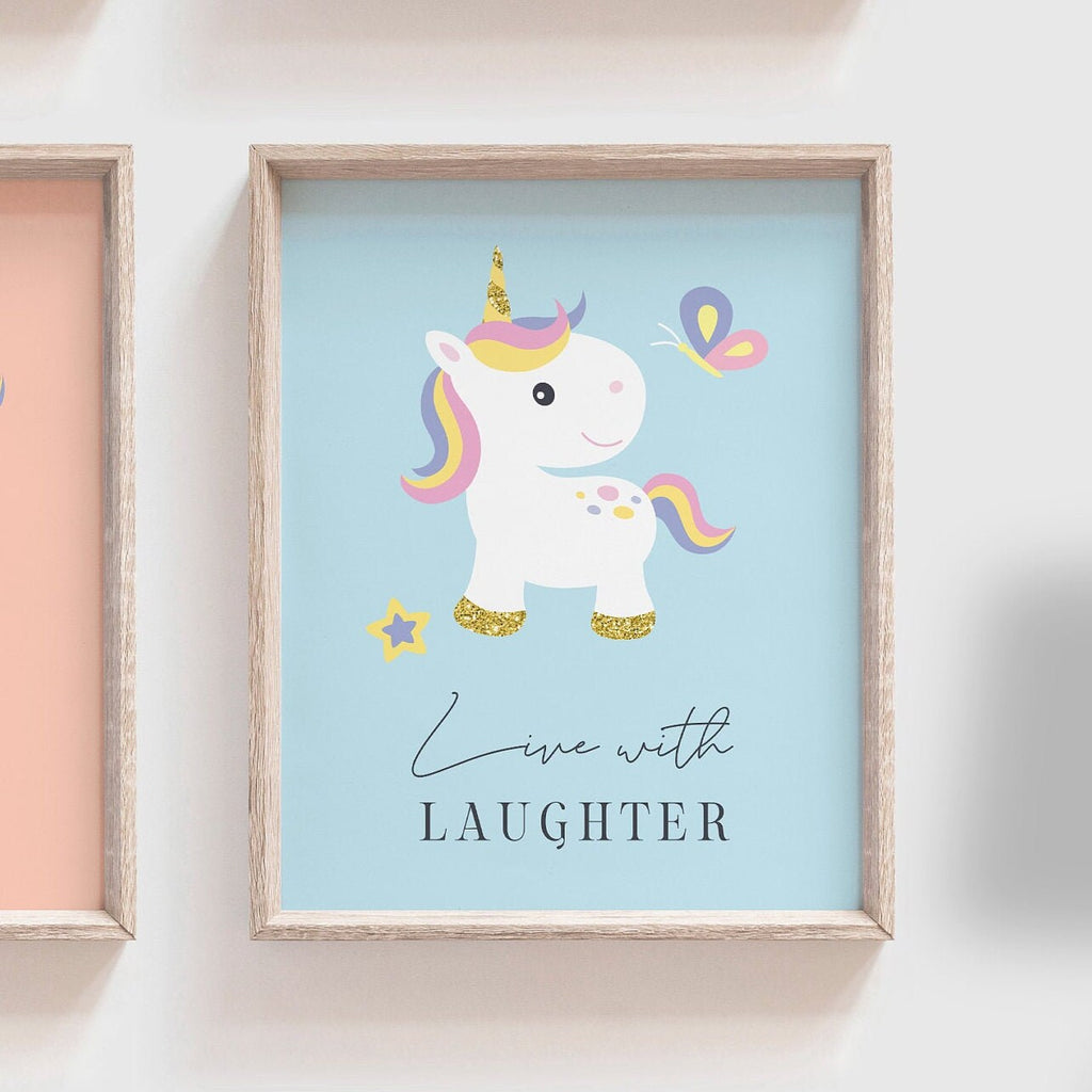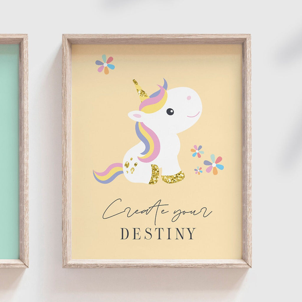 Product description: Unicorn theme prints with backgrounds in baby green, peach, powder blue and pastel yellow. Matching inspirational sayings reading, "Believe in yourself. Create your Destiny. Follow your dreams. Live with laughter." Other options are also available in my shop. Words can be customized to your liking.