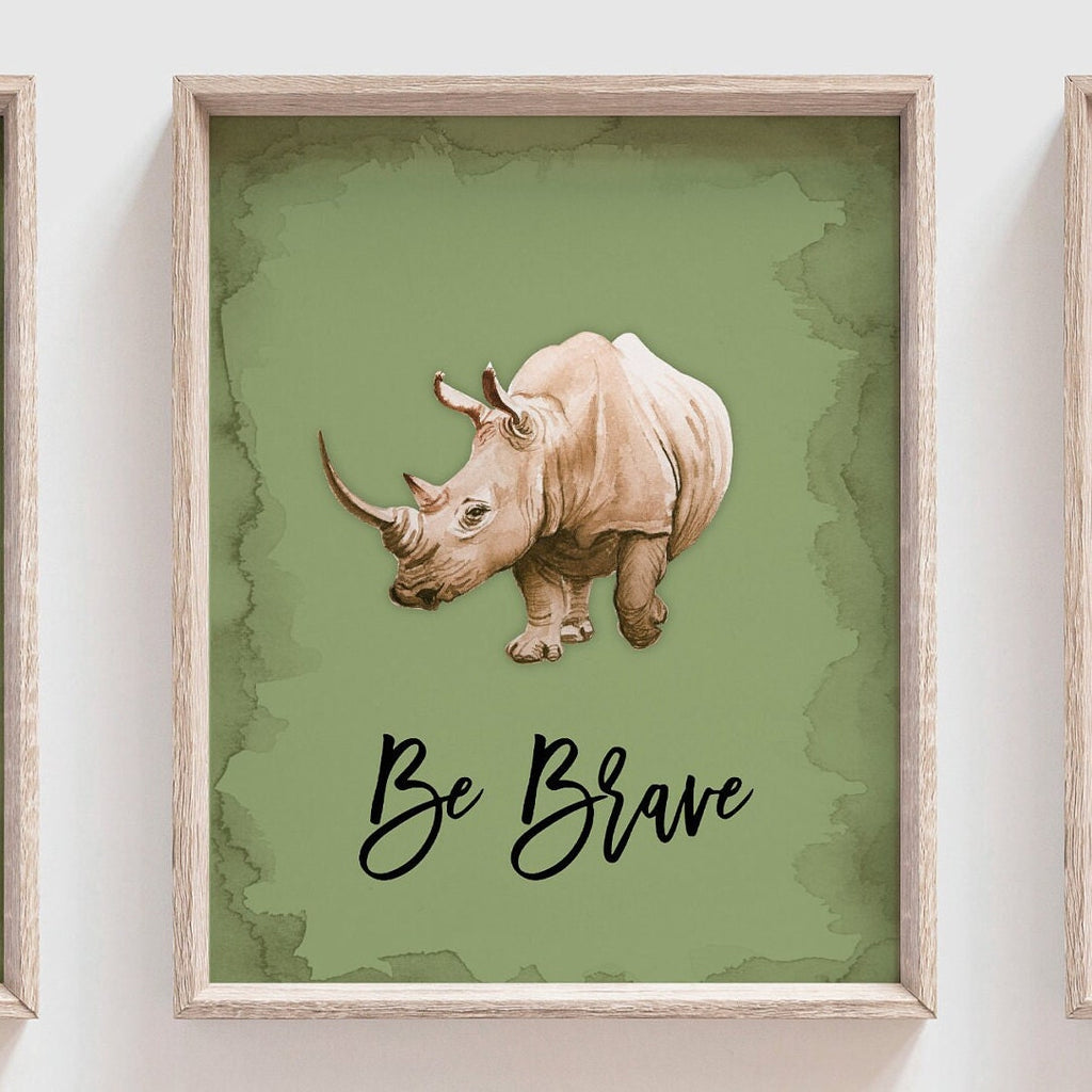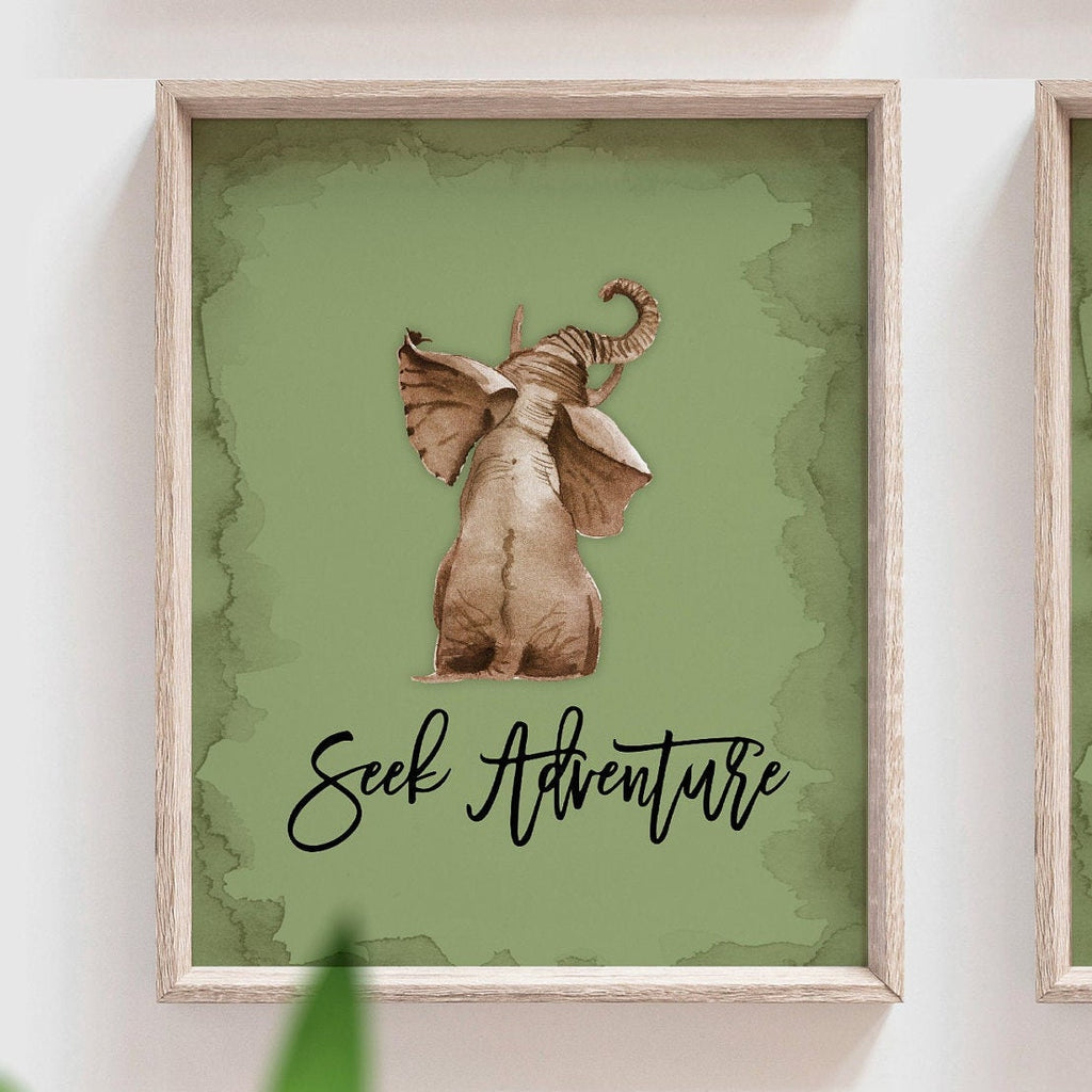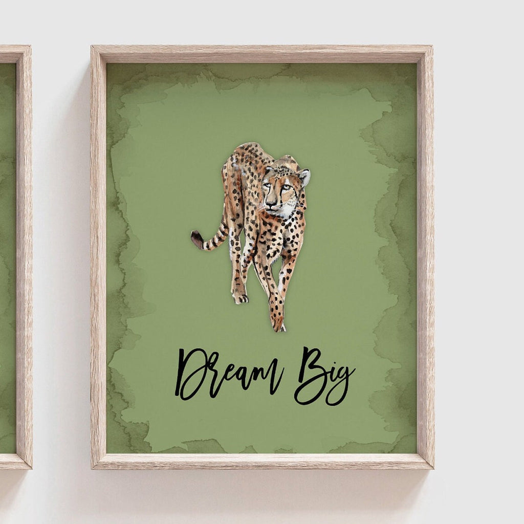 Product description: Safari watercolor animal theme prints including a giraffe, rhinoceros, leopard, elephant, antelope, and lion featuring 'clover' colored backgrounds and watercolor textured borders. You can request to swap out any of the animals with a zebra, heron, flamingo, lioness, ostrich, parrot, or shakal. Please specify in the 'notes to seller' section during checkout. Other options are also available in my shop.