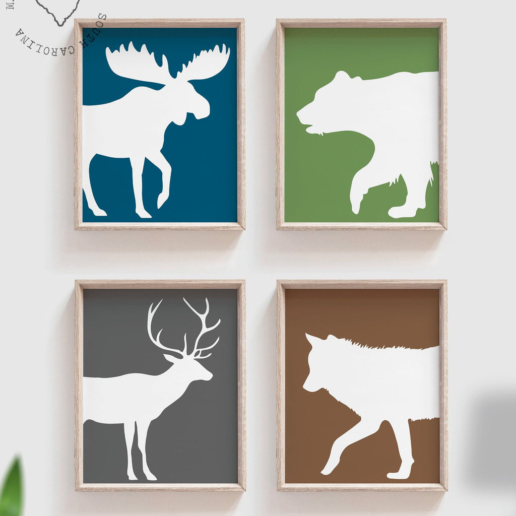 Boys woodland wall art, moose, deer, fox, bear, boys bedroom wall decor, boys bedroom, boys nursery, brown green gray blue, boy wild animals