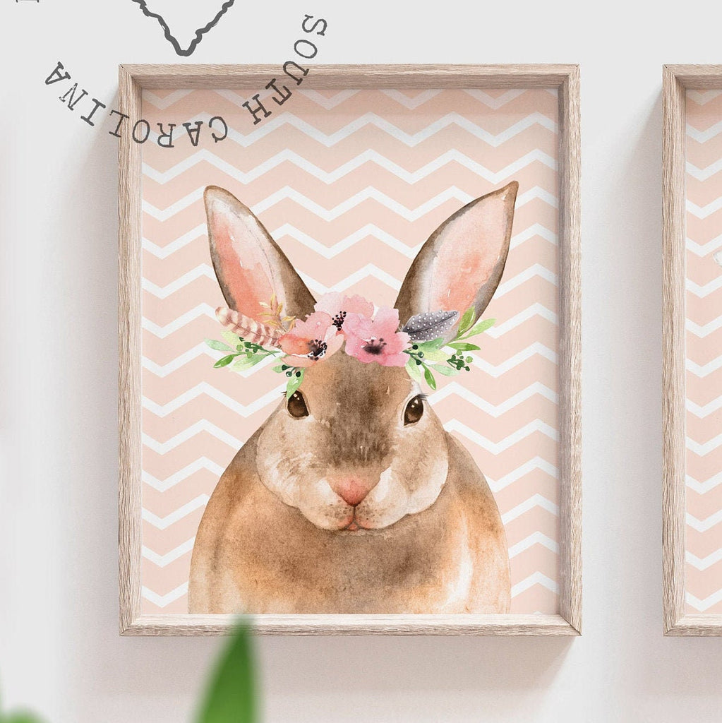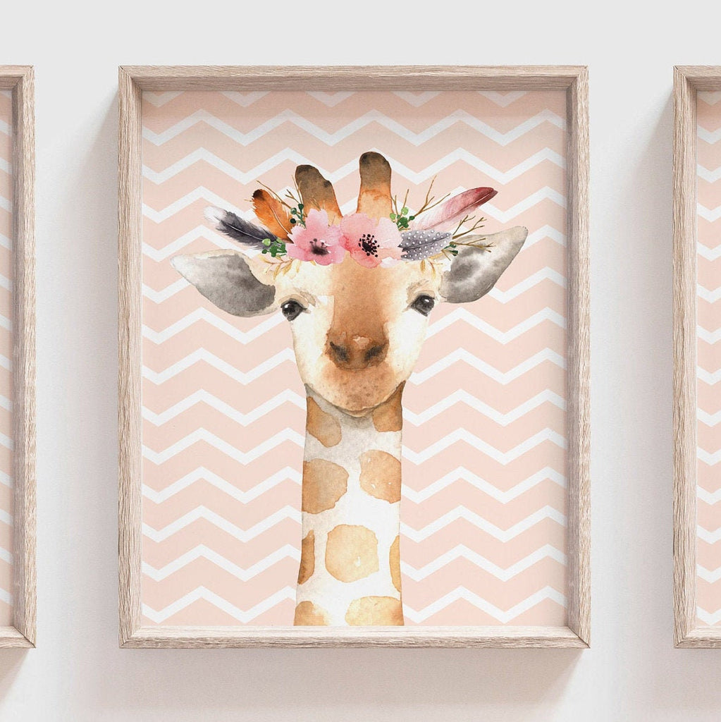 Product description: Woodland prints including a bunny, deer and giraffe with soft blush and white chevron backgrounds. The background color can changed to your liking.