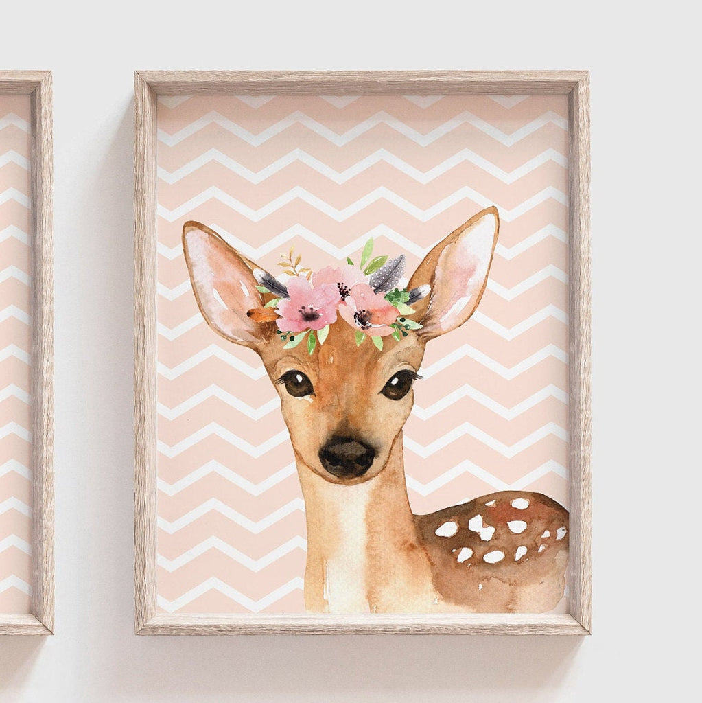 Fawn nursery print, woodland fawn nursery, woodland girl nursery prints, woodland animals pink flower crowns, baby girl art nursery decor