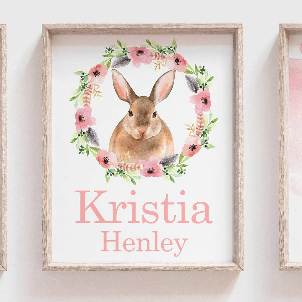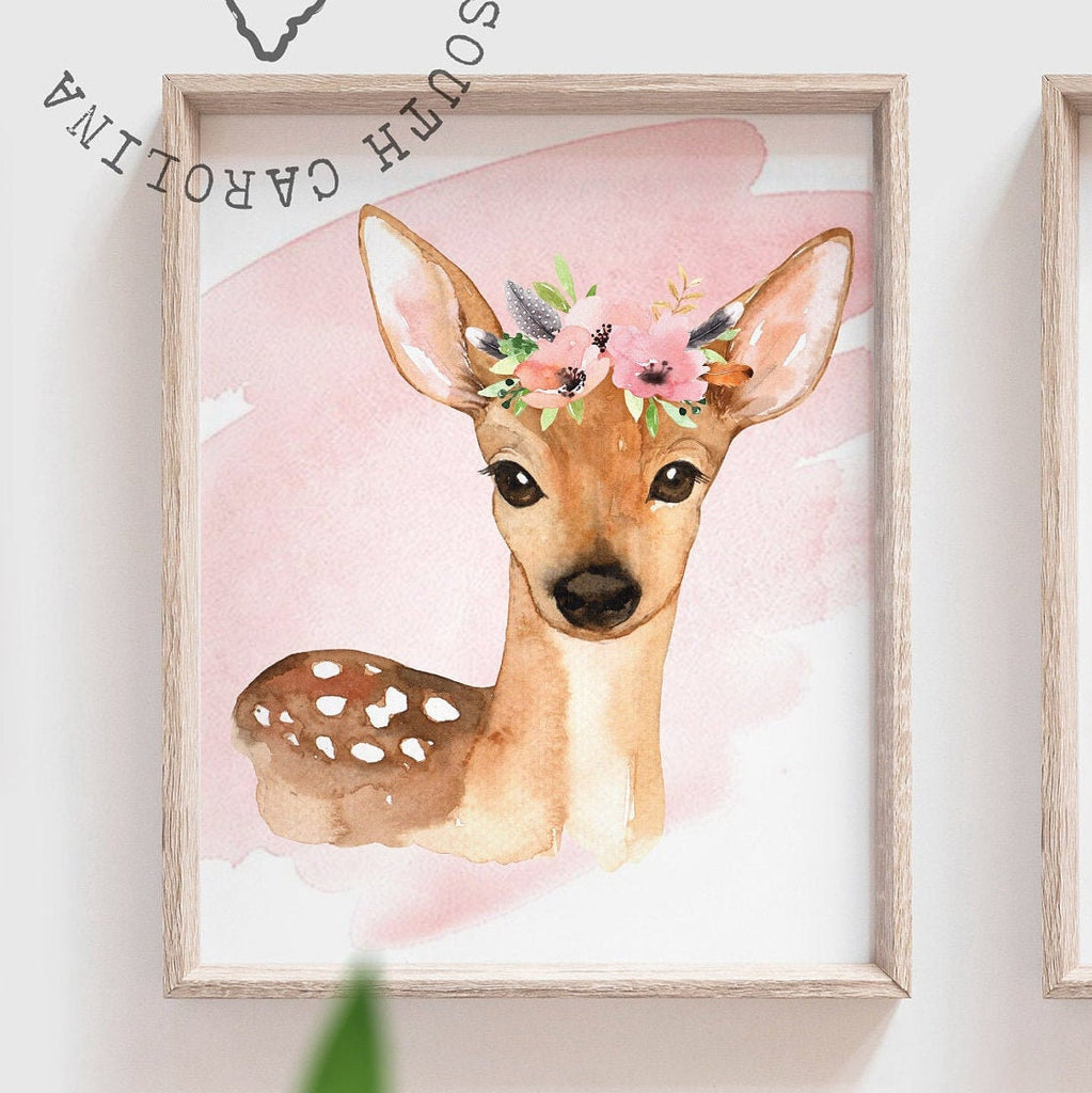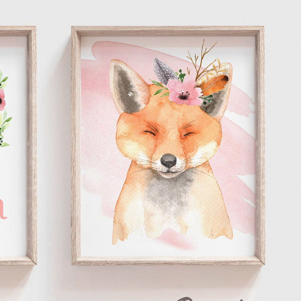 Product description: Woodland theme watercolor prints featuring a fox, bunny and fawn deer accented with flowers and a matching monogram print to be customized with your child's first and middle name. Other options are also available in my shop.