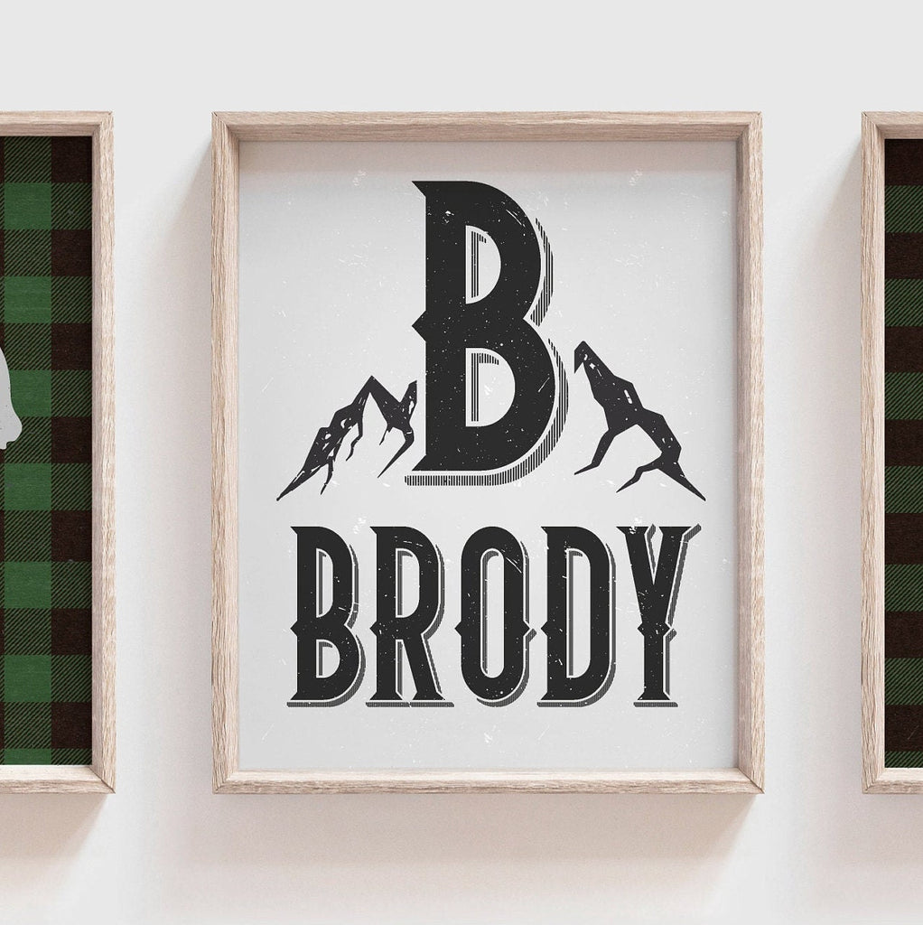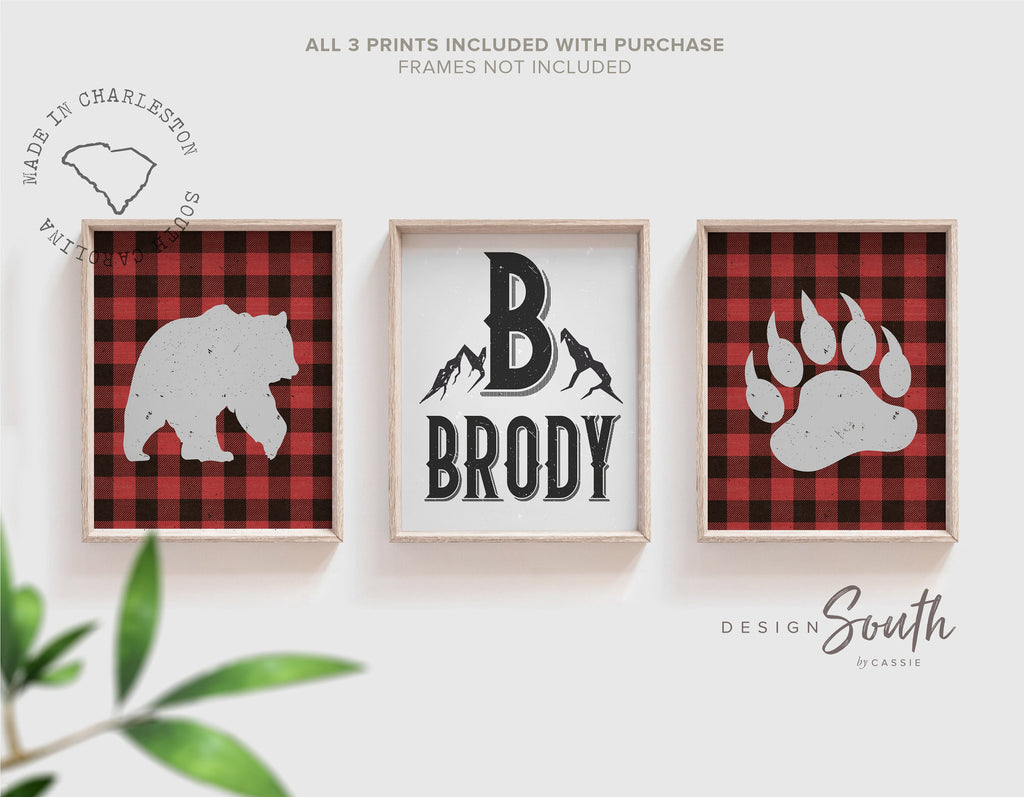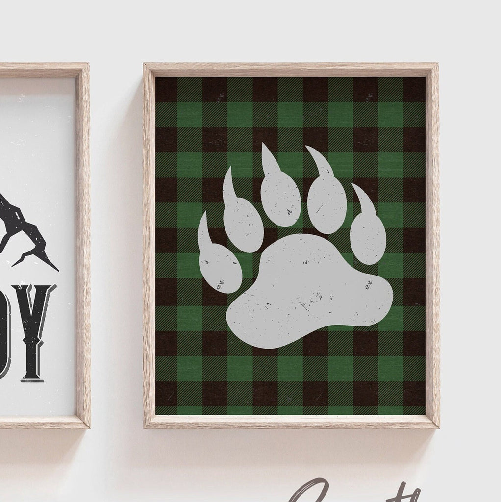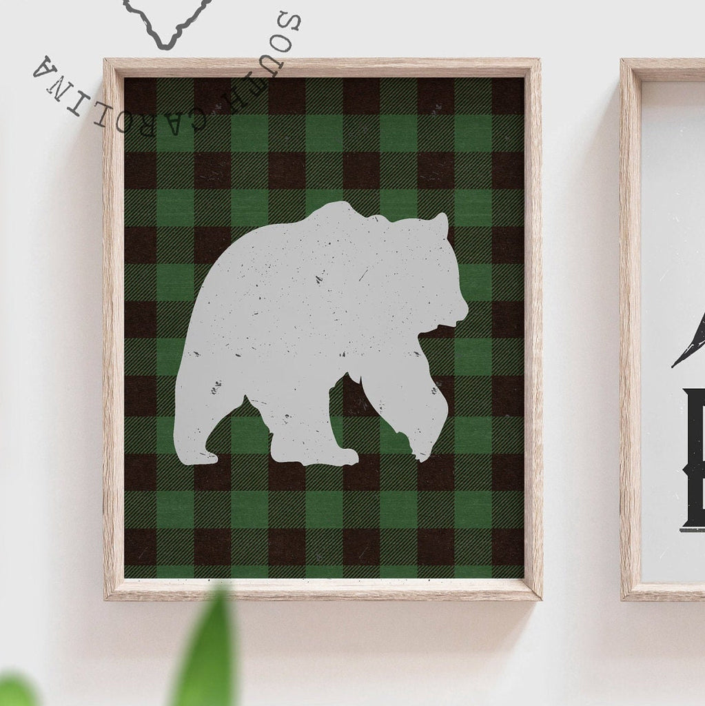 Forest green bear wall art, green buffalo plaid woodland nursery art, wildlife nursery, nature nursery, forest animals, boy bedroom wall art