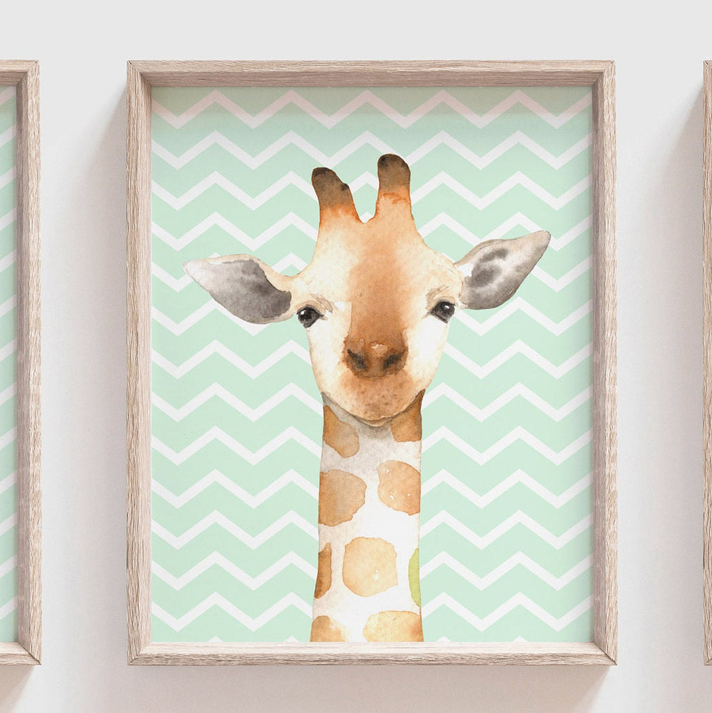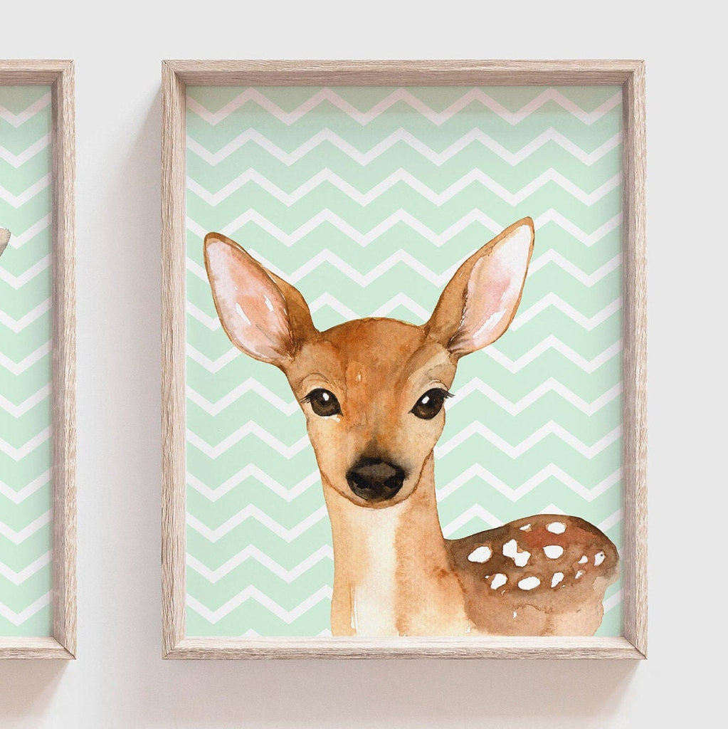 Gender neutral woodland, gender neutral animal art for nursery, unisex nursery, mint nursery, giraffe, deer, bunny, baby boy nursery decor
