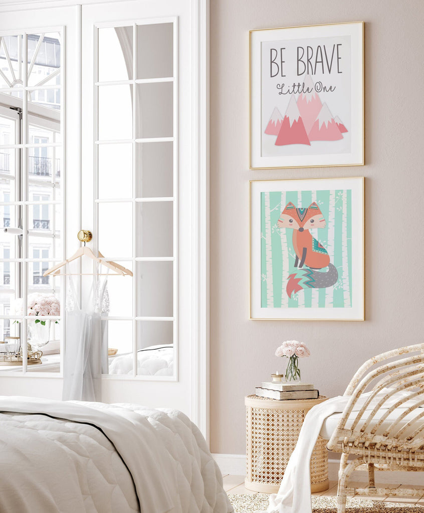 Girl fox, pink coral and mint woodland, girl tribal nursery, baby girl woodland, fox nursery prints, fox wall art, fox nursery decor, boho