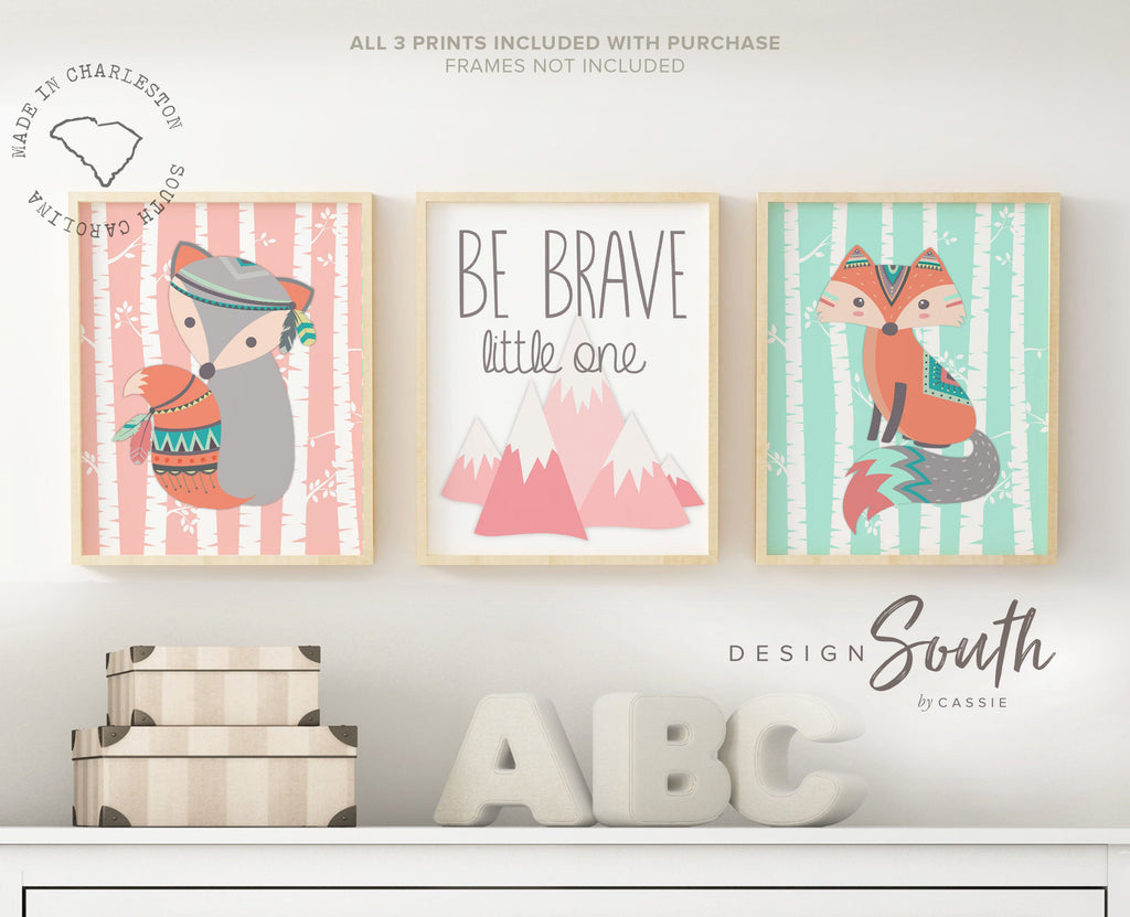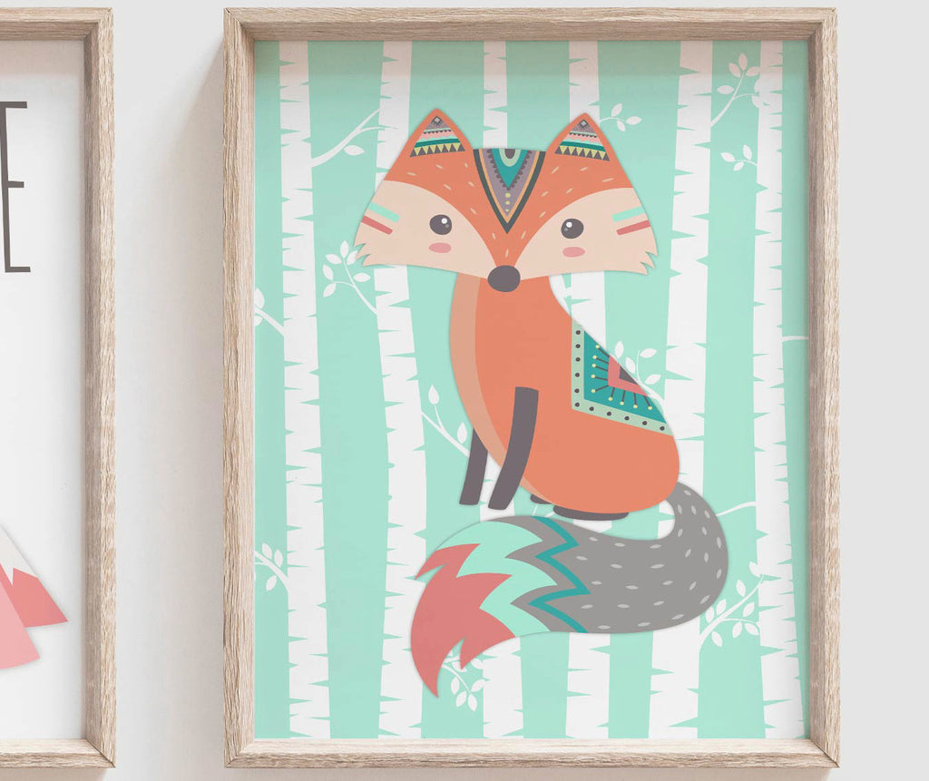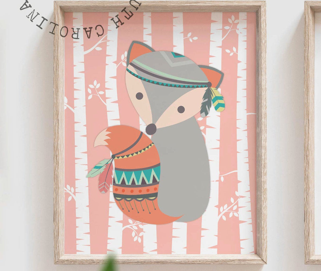 Girl fox, pink coral and mint woodland, girl tribal nursery, baby girl woodland, fox nursery prints, fox wall art, fox nursery decor, boho