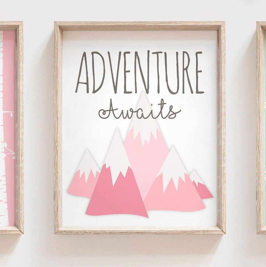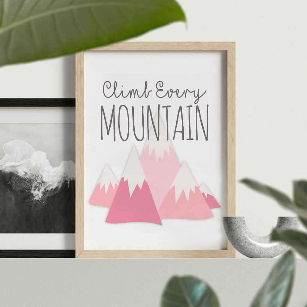 Product description: Tribal fox designs with bubblegum and light teal birch tree pattern backgrounds and matching quote reading, "Climb every mountain." Alternative wording options are also available.