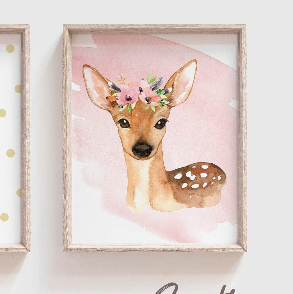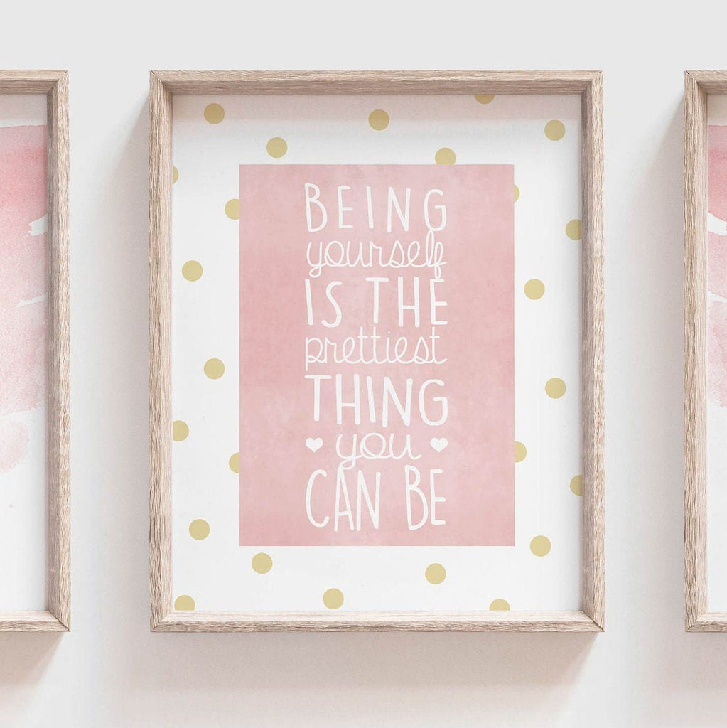 Product description: Forest friends including a bunny and a fawn deer with matching quote reading "Being yourself is the prettiest thing you can be." Background is white with a digital watercolor texture. The colors of the middle print can be changed to your liking.