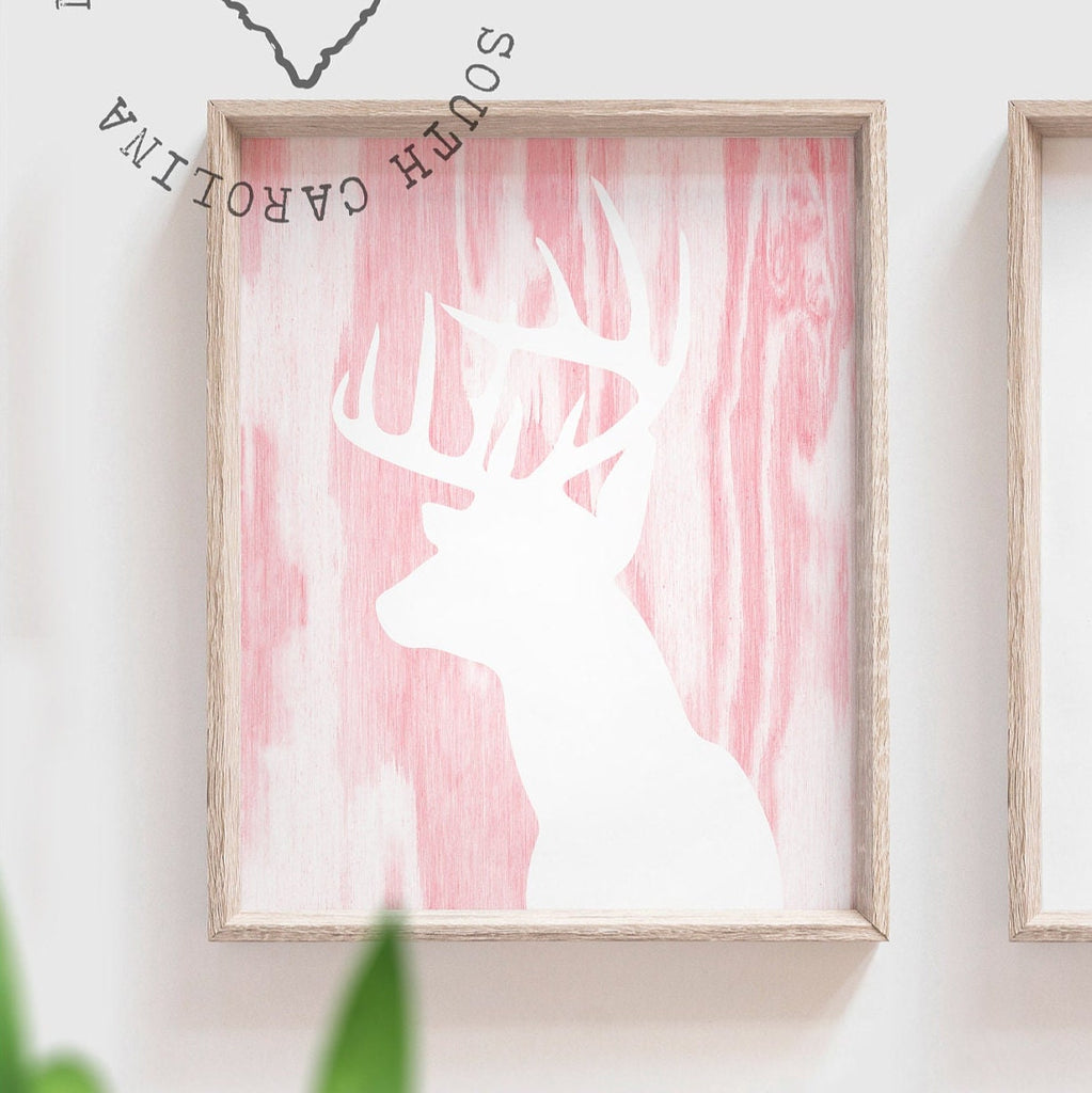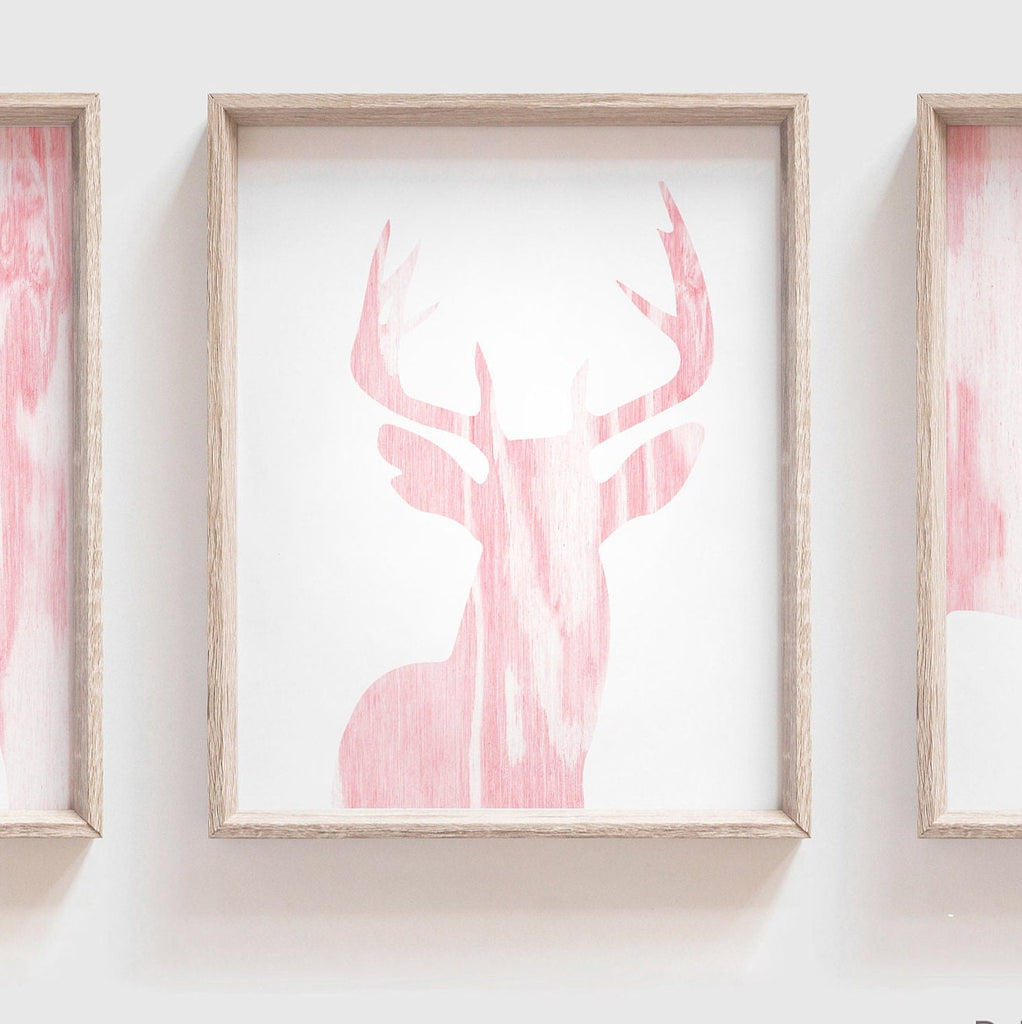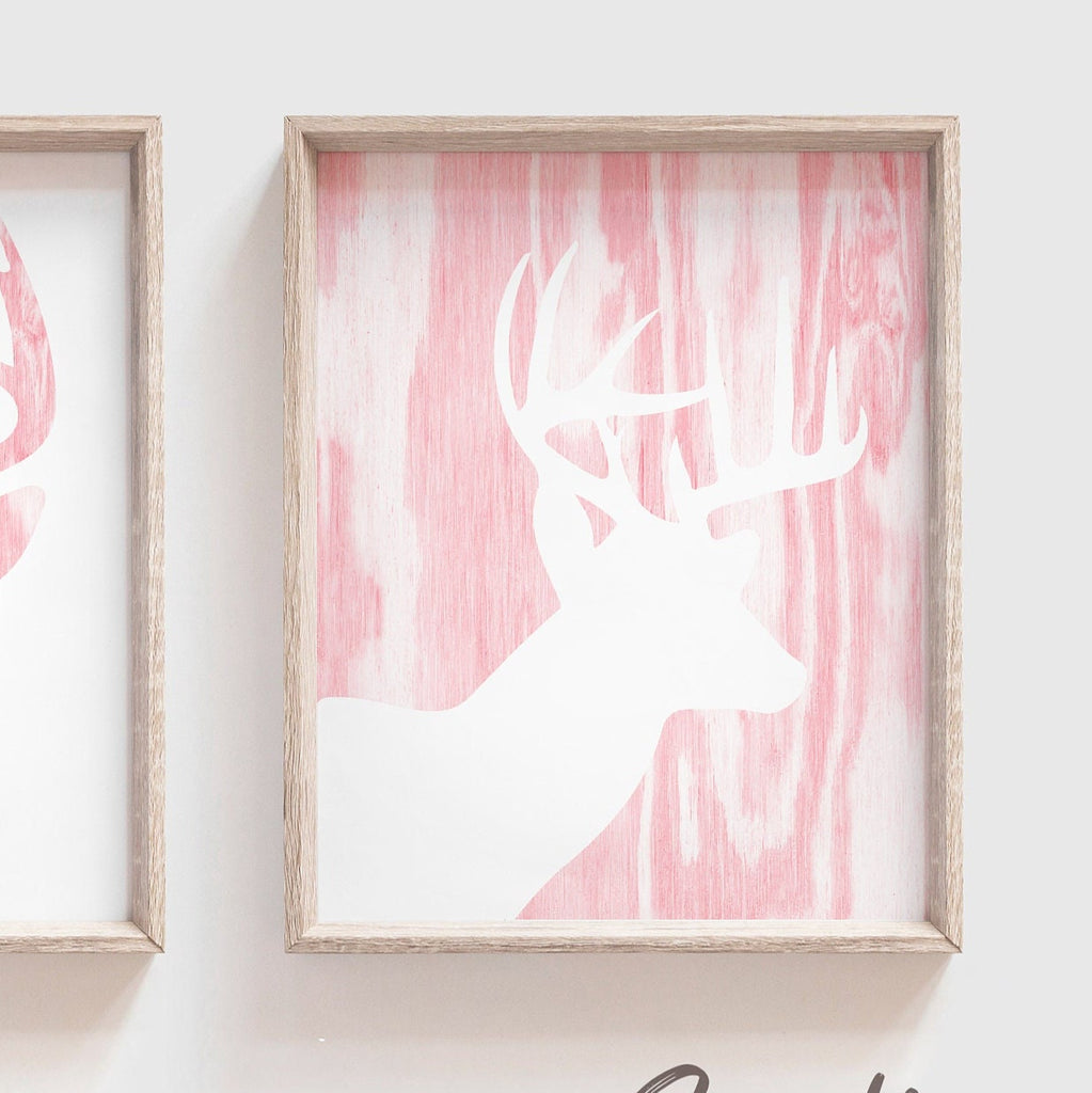 Product description: Wall art prints featuring white deer head silhouettes with pink wood textured backgrounds. Other options are also available in my shop.