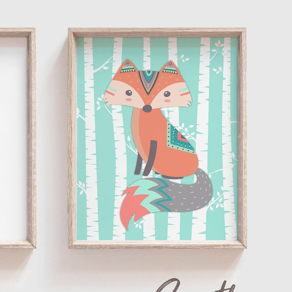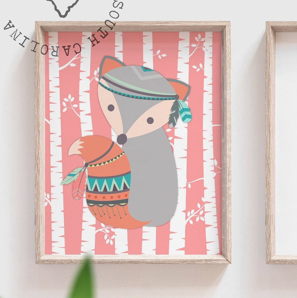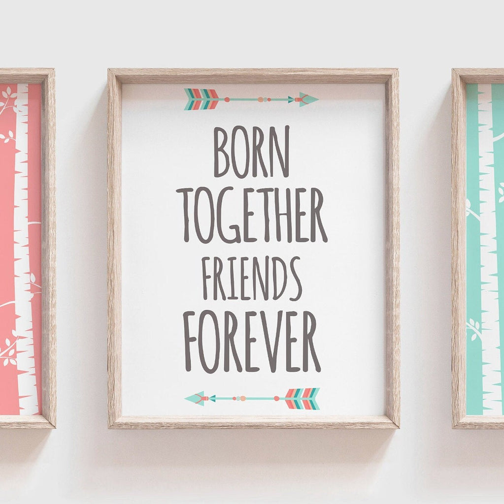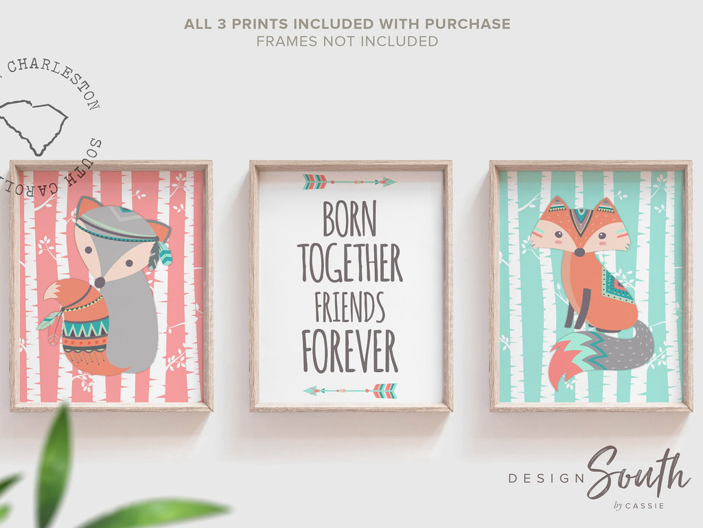 Product description: Woodland fox designs with coral and light teal birch tree backgrounds and matching quote print reading, "born together, friends forever with accented arrows. Other options are also available in my shop.