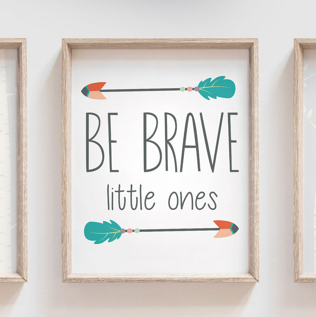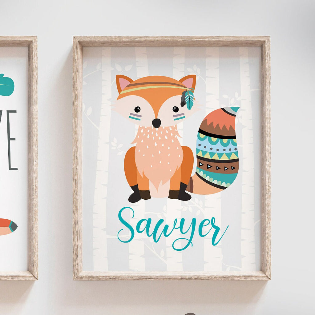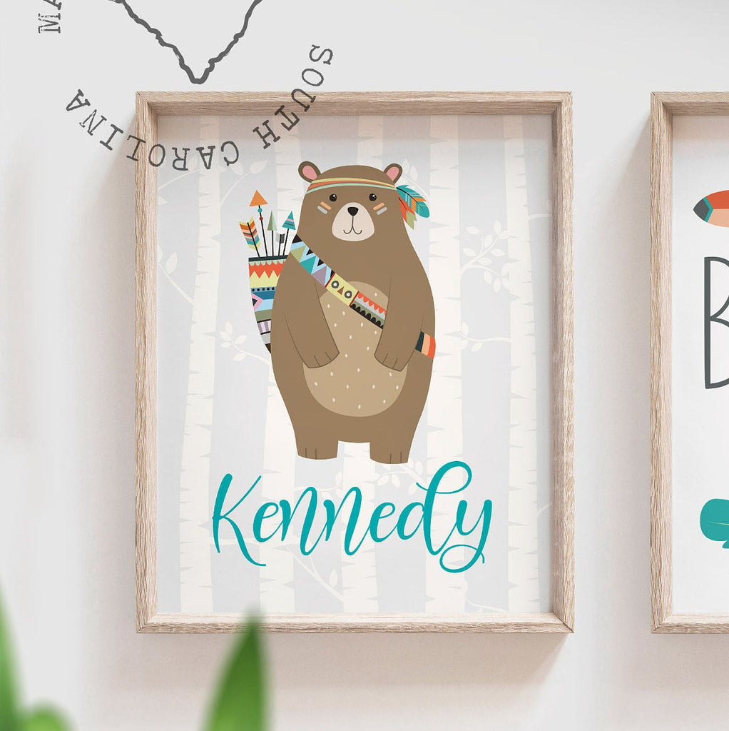 Product description: Woodland tribal theme prints featuring a bear and fox, two kids' names, and a matching quote reading, "Be brave little ones." Other options are also available in my shop.