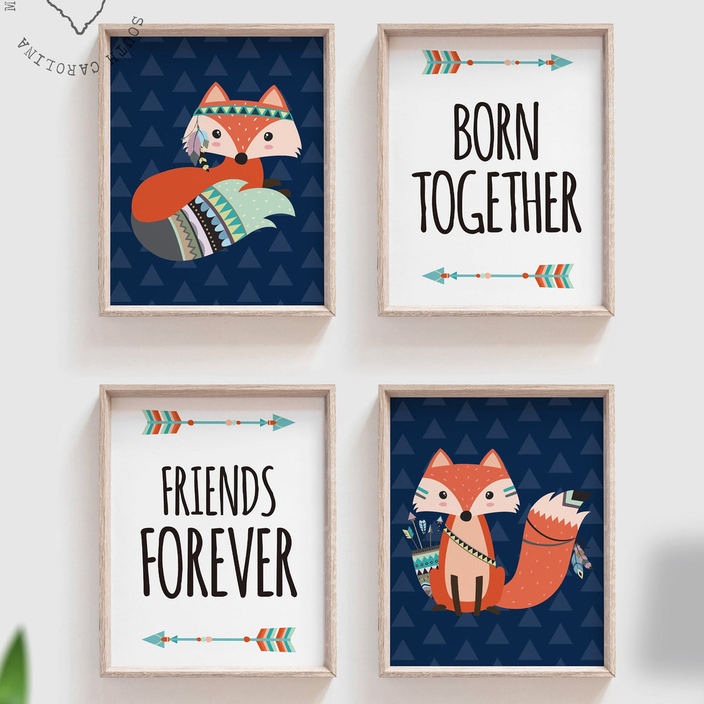 Product description: Tribal fox designs with navy tribal pattern backgrounds and with matching quote reading "Born together friends forever." Other color options available.