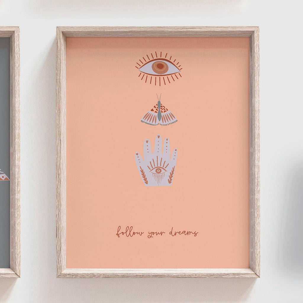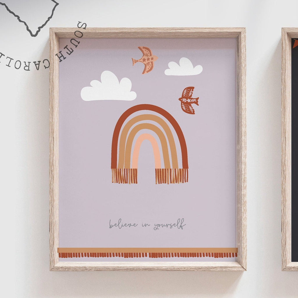 Product description: Boho design prints in a neutral color scheme with sayings reading, "believe in yourself, seek adventure, stay positive, follow your dreams." Please note* colors used in this listing were customized to match a customer's decor and are not on the color chart. Other options are also available in my shop.
