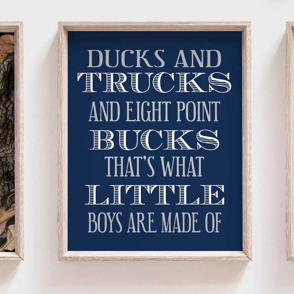 Product description: White-tailed deer prints with a camouflage background. Navy blue center with white text reading, "Ducks and trucks and eight point bucks, that's what little boys are made of."