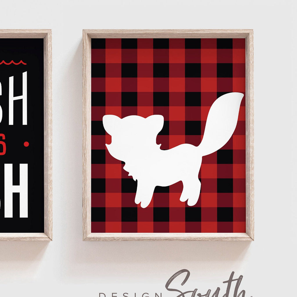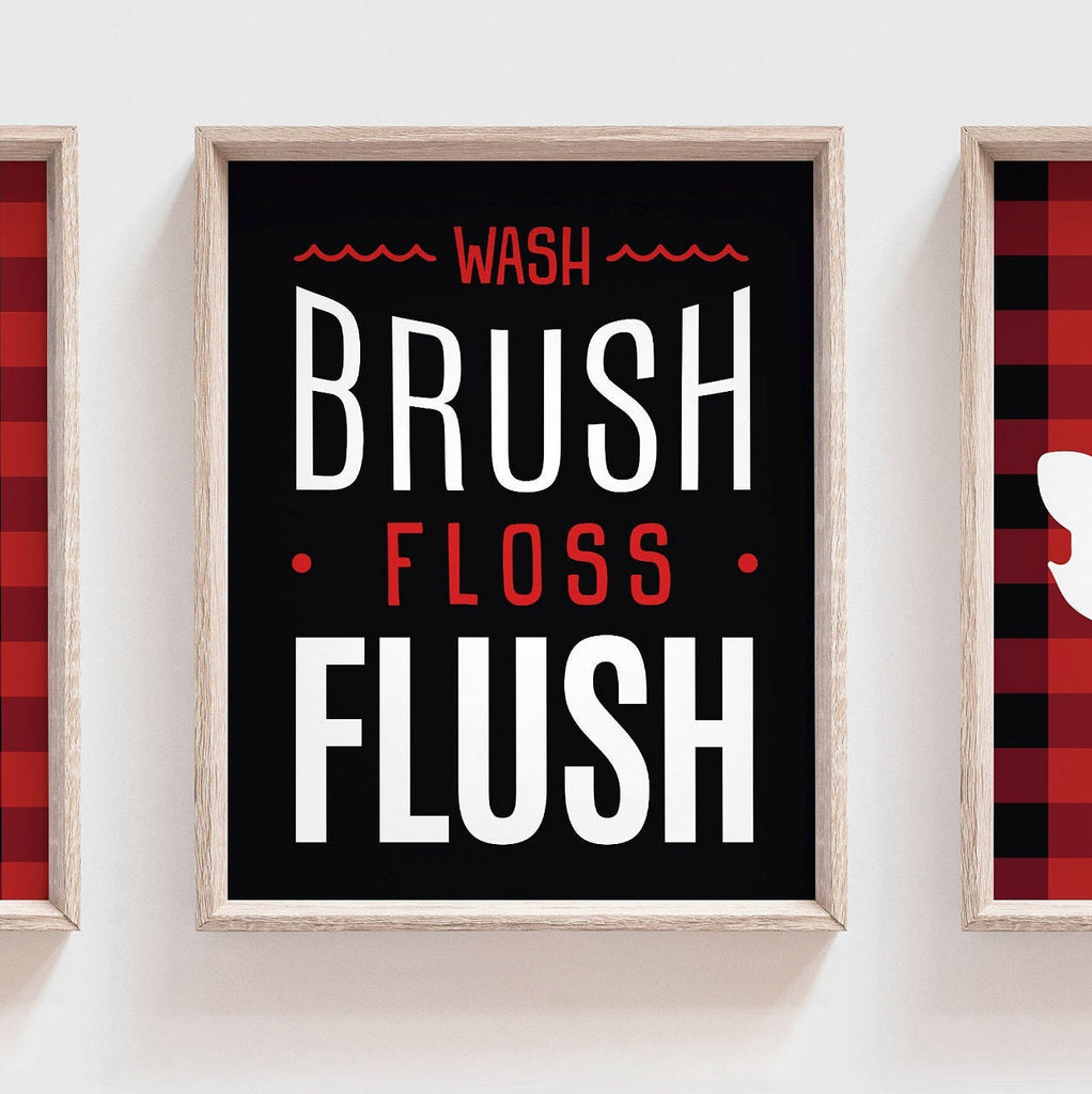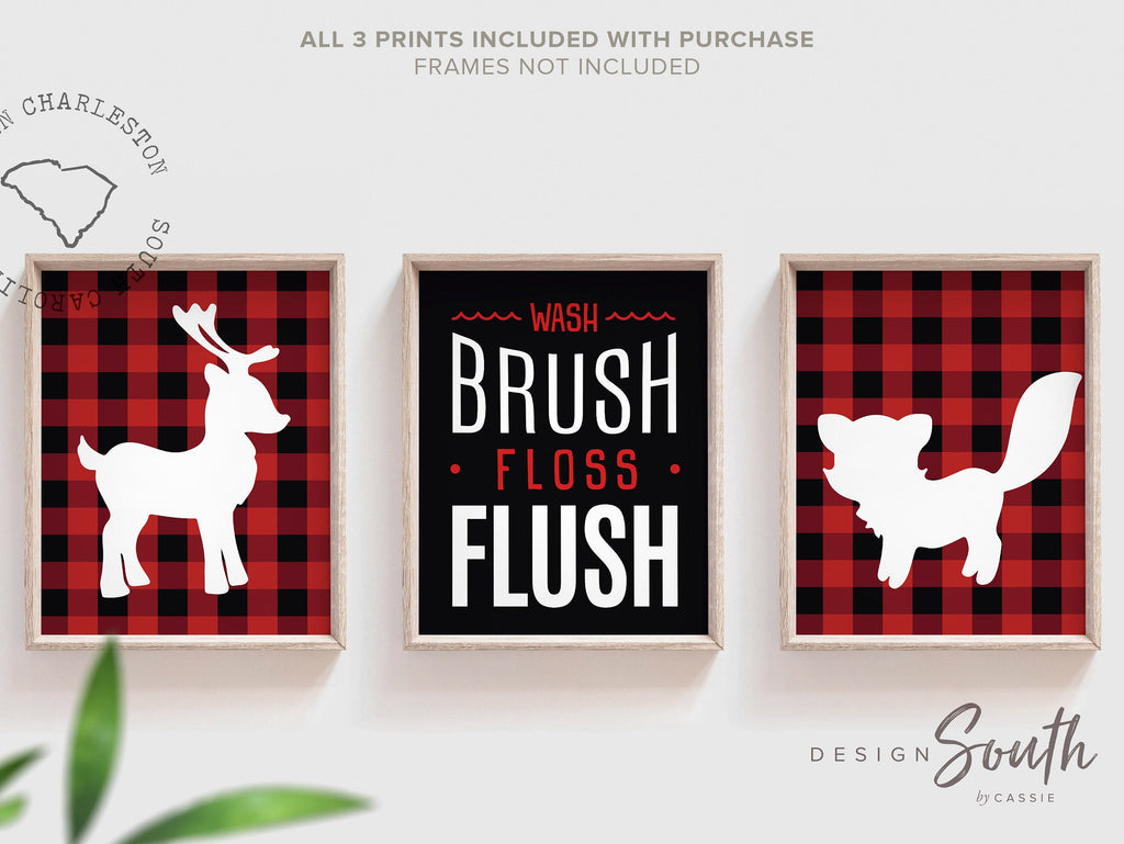 Woodland theme children's bathroom, deer fox wash brush flush, buffalo check shower bathroom decor, lumberjack bathroom children's wall art