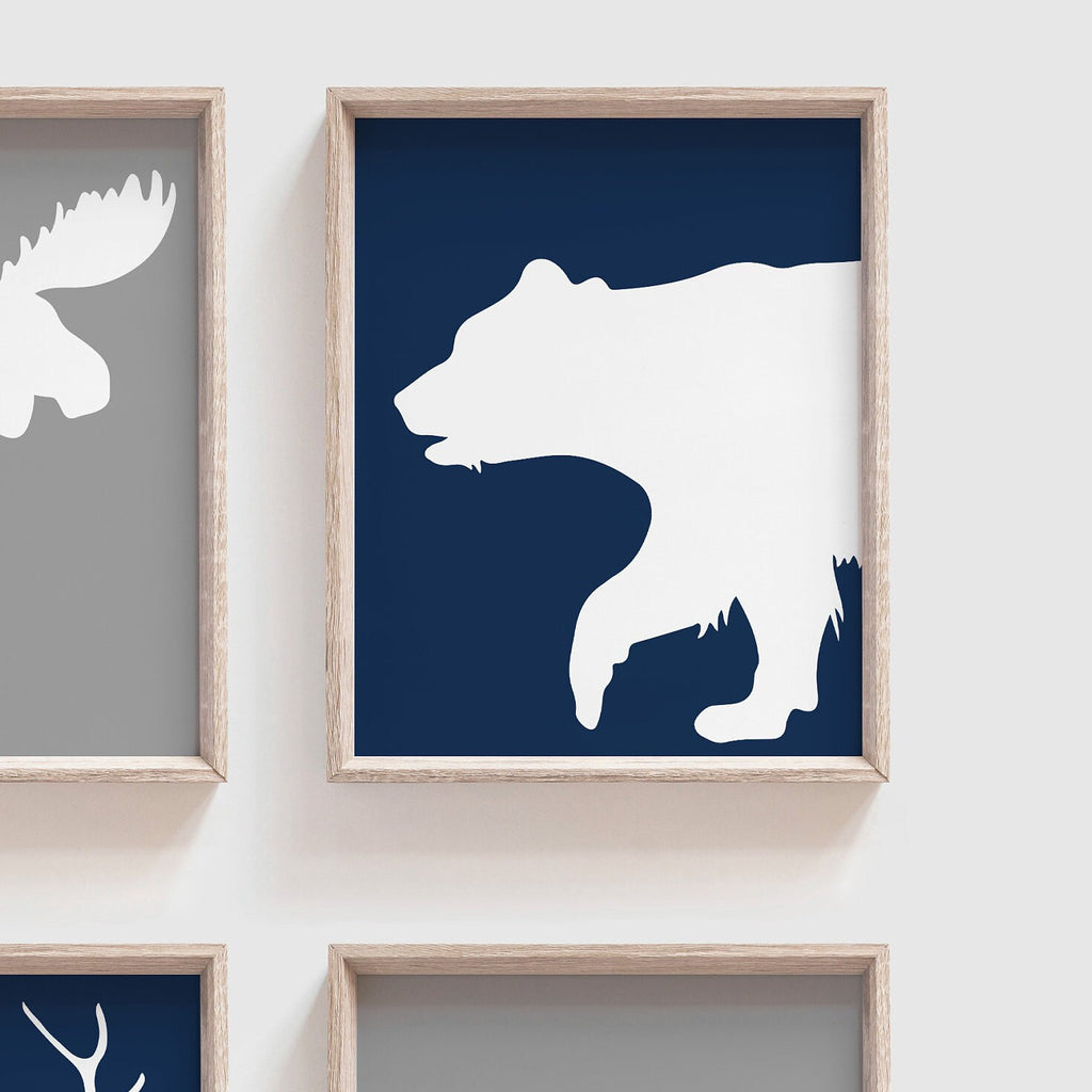 Woodland wall art navy blue gray, boy's bedroom, boy's nursery decor, forest animals, boy's woodland nursery, bear deer moose wolf boy's art