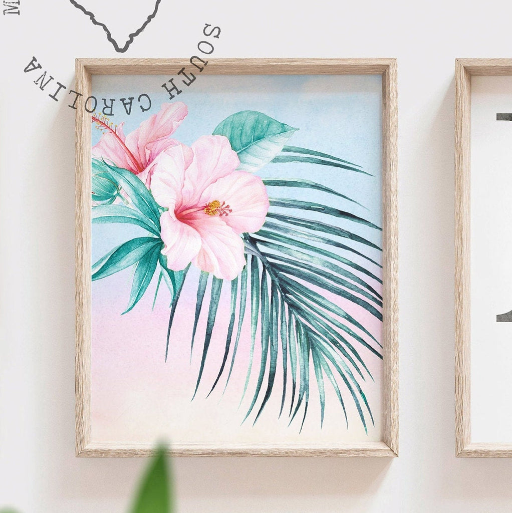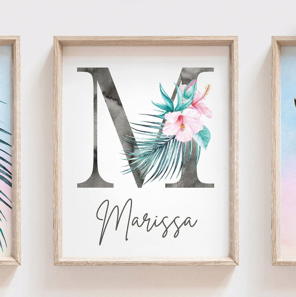 Product description: Tropical theme watercolor flamingo prints accented with hawaiian flowers, palm leaves and matching monogram print to be customized with your child's name and initial. Other options are also available in my shop.