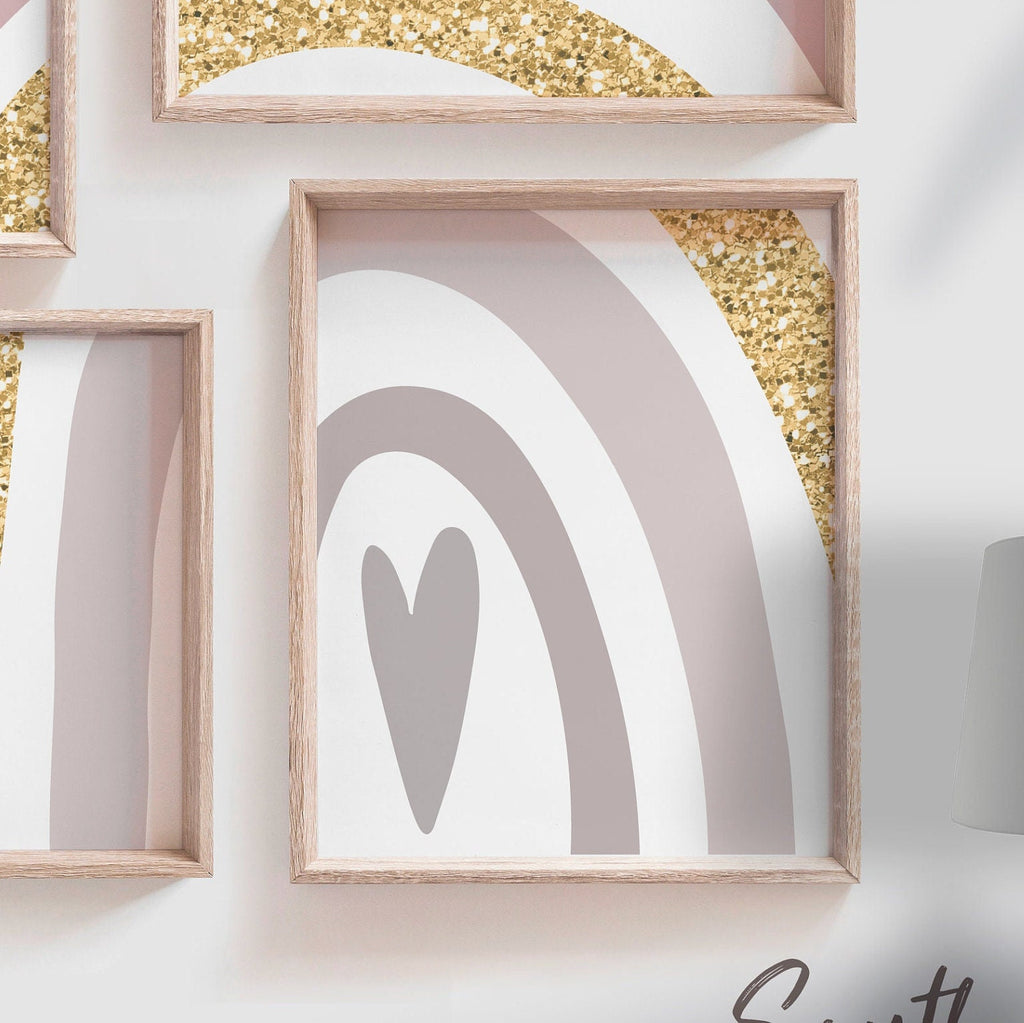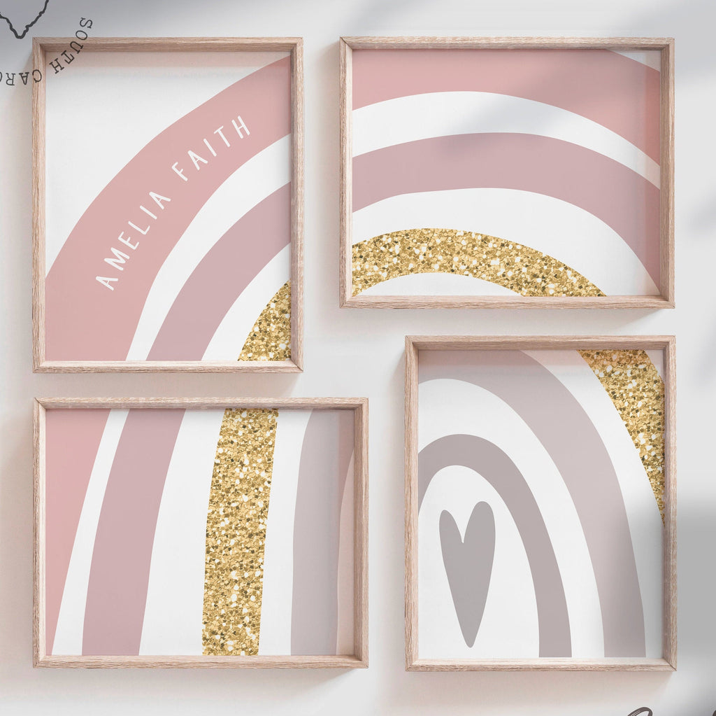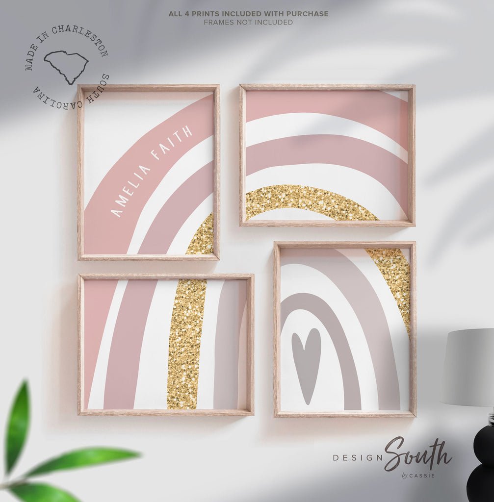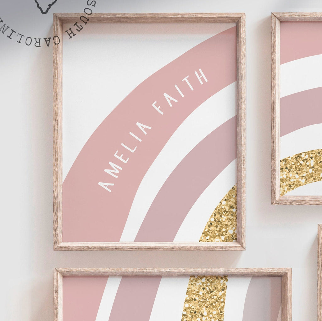 ☛ ☛ ☛ FRAMES ARE NOT INCLUDED ☚ ☚ ☚Thank you for choosing Design South. 🌸I take pride in creating all of my designs. These contemporary rainbow theme wall art prints will redefine the walls of a girl's nursery, playroom, bathroom or bedroom. Each design is curated with a passion and vision to create inspired spaces for you and your little ones.Ready to order THESE prints for your home decor? It’s EASY! Complete check out and include any color changes you may need in the ‘notes to seller’ section during checkout. After purchase, I will send you a proof for your review and approval before printing. ----------------♥ WHAT YOU WILL RECEIVE ♥-----------------➤ Four UNFRAMED art prints. Product description: Rainbow design prints in a pink color scheme with faux gold sparkles and matching personalized print to be customized with your child's name. If you like this design, and not sure what your baby's name is going to be yet, you can simply state to remove it altogether, or replace with a saying such as, "you are so loved." Other options are also available in my shop.Colors can be customized. A color change is included in the price. Frames are for decoration purposes and are not included. The prints should be framed behind glass once received. These are not canvas prints. My art is professionally printed on high-quality fine art paper. Each piece is printed as ordered. --------------------♥ HOW TO CHECKOUT ♥--------------------1. Indicate if you would like the prints as shown OR if you would like a color change. If you do not indicate a color change, Design South will assume that you would like the prints in the colors shown above. **NOTE: Please leave a message in the 'notes to seller' section during checkout with your color choices from the chart above if you are requesting colors that are different from this listing. If you do not see the color(s) you want, send me a message! I also accept pictures of nurseries, bedding, and decor for color matching. In the case of a COLOR CHANGE, I will send you a PROOF to your email account. I will use the email account associated with your Etsy account, unless otherwise noted. Please VERIFY the proof, so that I can print and ship your order. Waiting to verify your proof will delay shipping. 2. Enter the name you want on the personalized print in the 'personalization' box.3. Choose the size of your prints. Options: 5x7, 8x10, 11x14. ---------------------------♥ TIMELINE ♥-----------------------------Timeline: Orders are carefully packaged and typically ready to ship within 3-5 business days. See my shop website for updated turnaround times. If you would like a custom order, visit my shop website and send me a message. Note: Custom orders will require a proof sent to you via email and confirmation regarding the proof for your order to be mailed. **Each day that I do not receive information such as your child's name, or an approval of the proof, it will delay the shipping date. -----------------------♥ TERMS OF USE ♥-------------------------Product cannot be reproduced, resold or distributed. The artwork in this shop is the property of Design South. The artwork offered here is for personal use only.Thanks for choosing Design South! - Cassie DESIGN SOUTH© COPYRIGHT 2022 / Design South / Cassie Rinehart