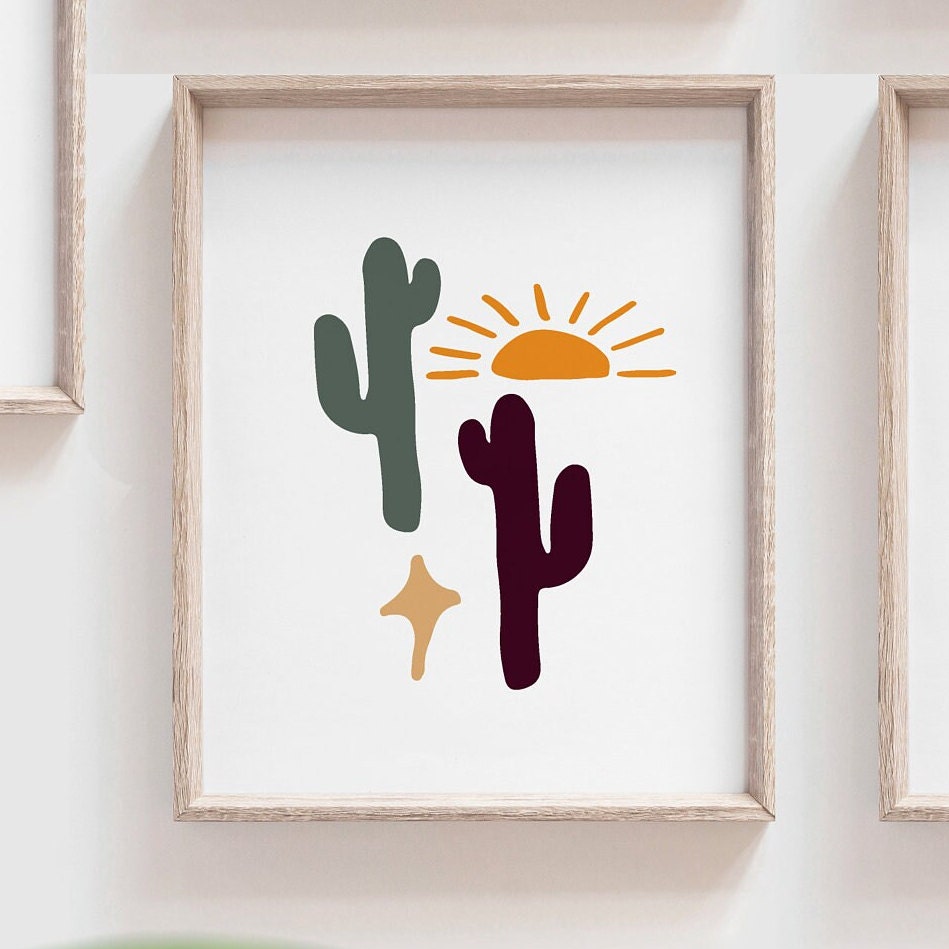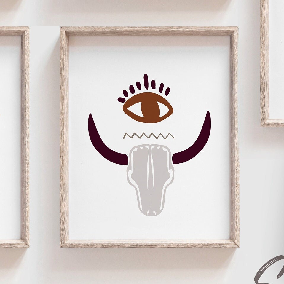 Product description: Boho modern art prints featuring cacti, half sun, animal scull, sailboat, rainbow, potted plant and vase with flower. Other options are also available in my shop.