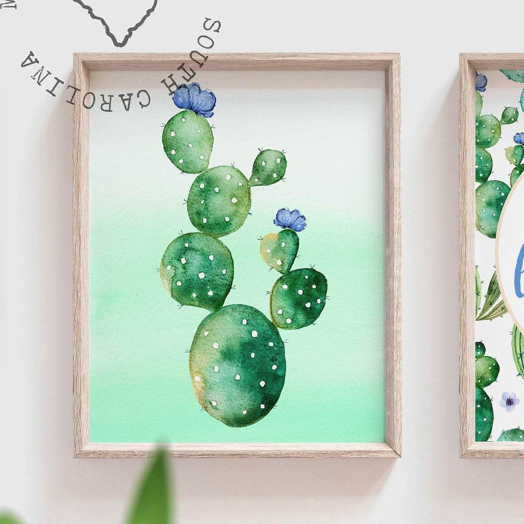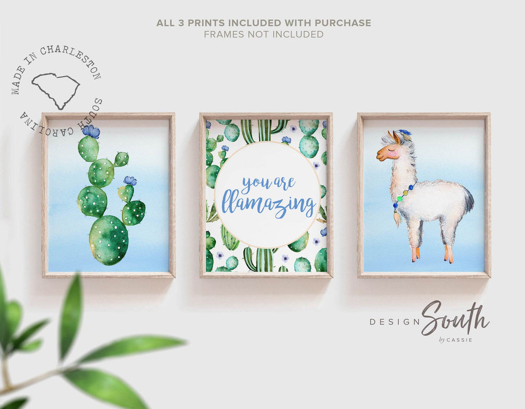 Product description: Boho watercolor prints featuring a llama and cacti with blooming blue flowers and a matching print reading, "You are llamazing." Other options are also available in my shop.