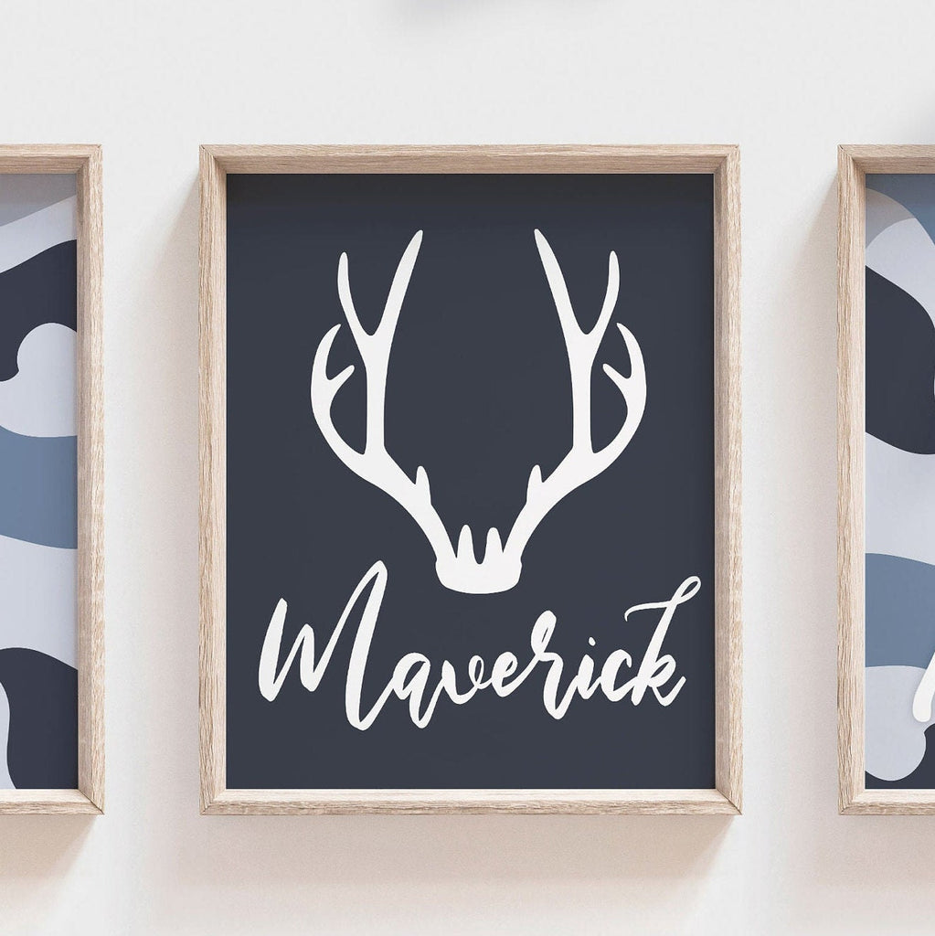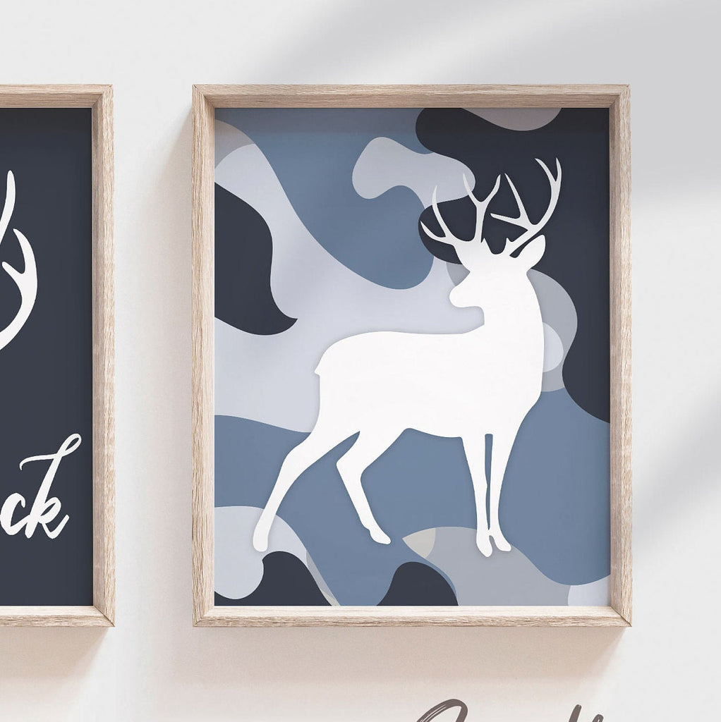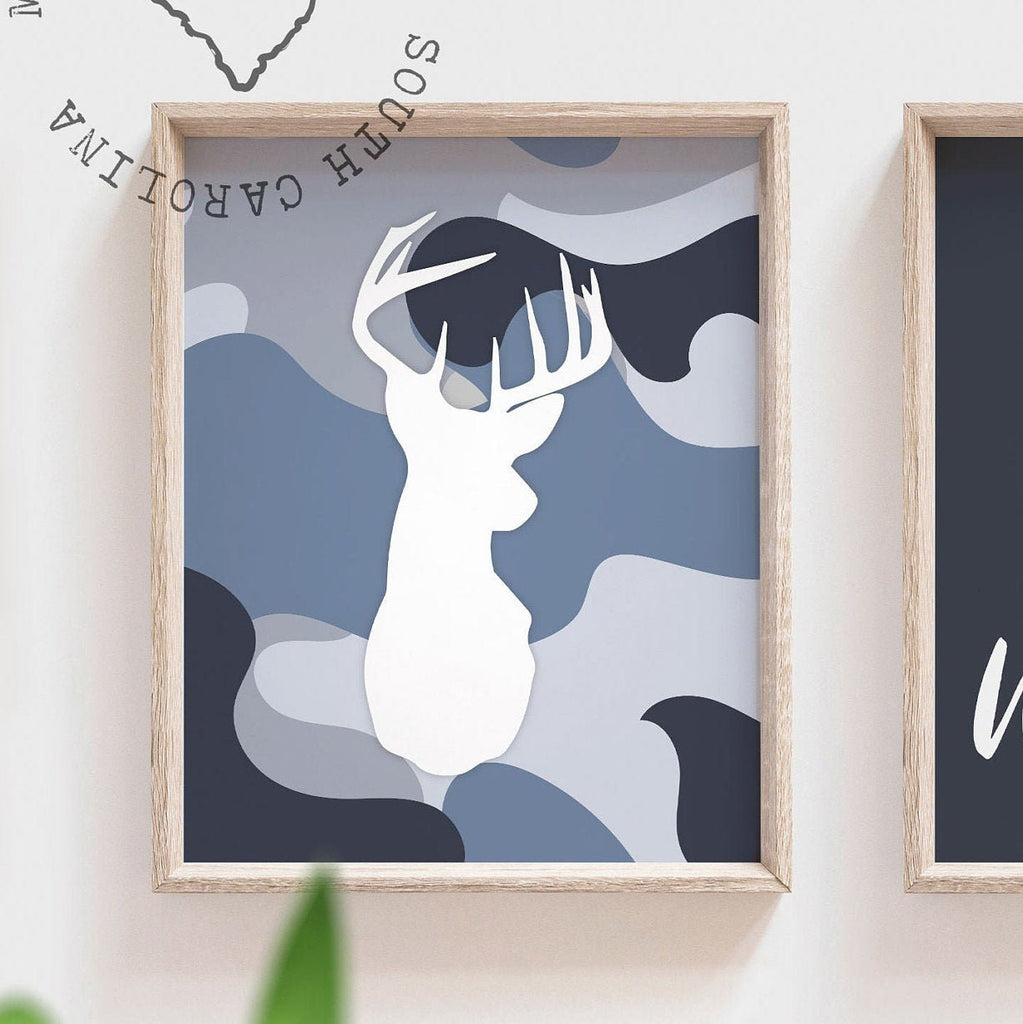 Boys personalized deer hunting art, navy blue deer nursery, navy deer nursery decor, camouflage baby boy decor name print, camo boys bedroom
