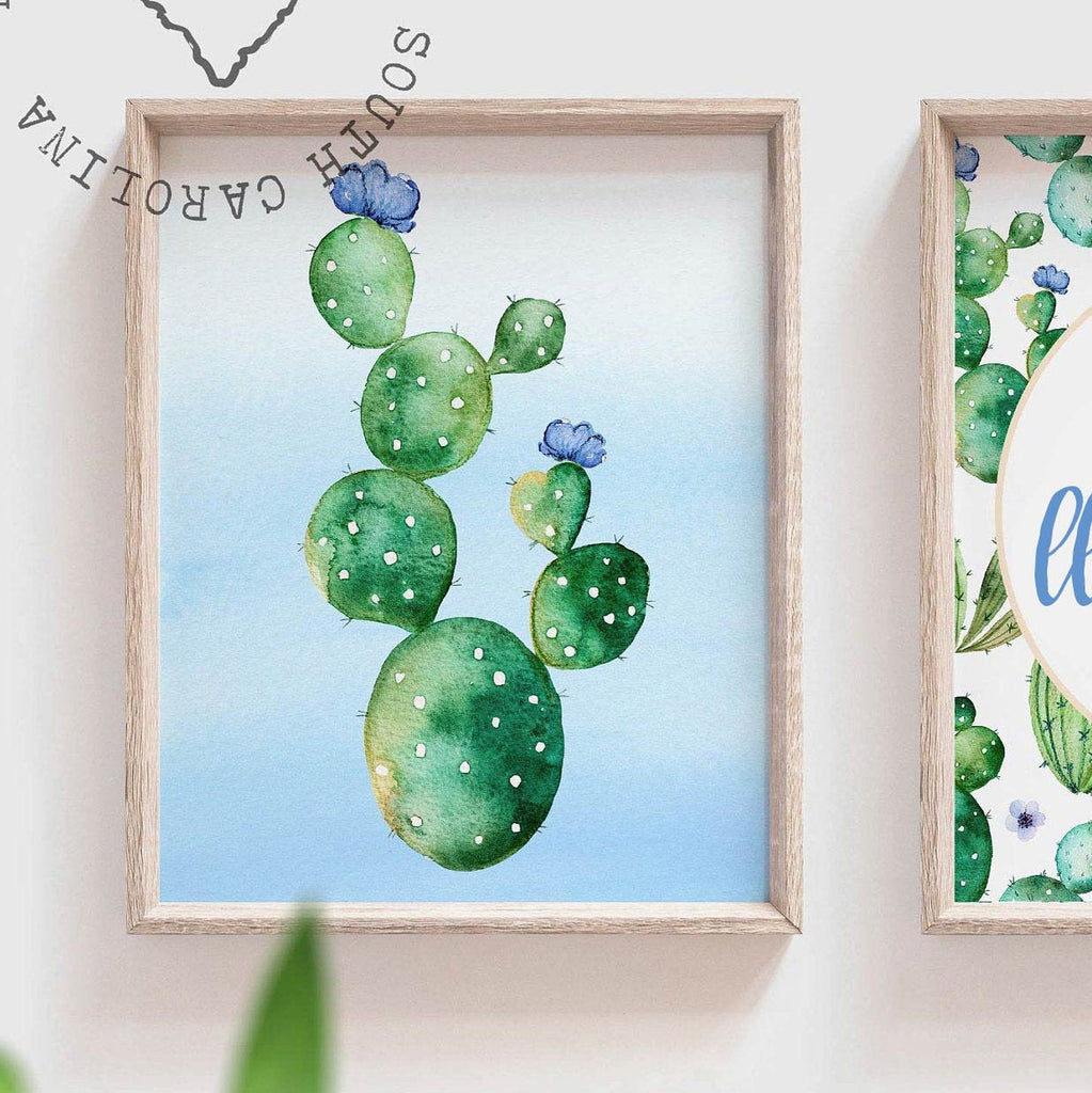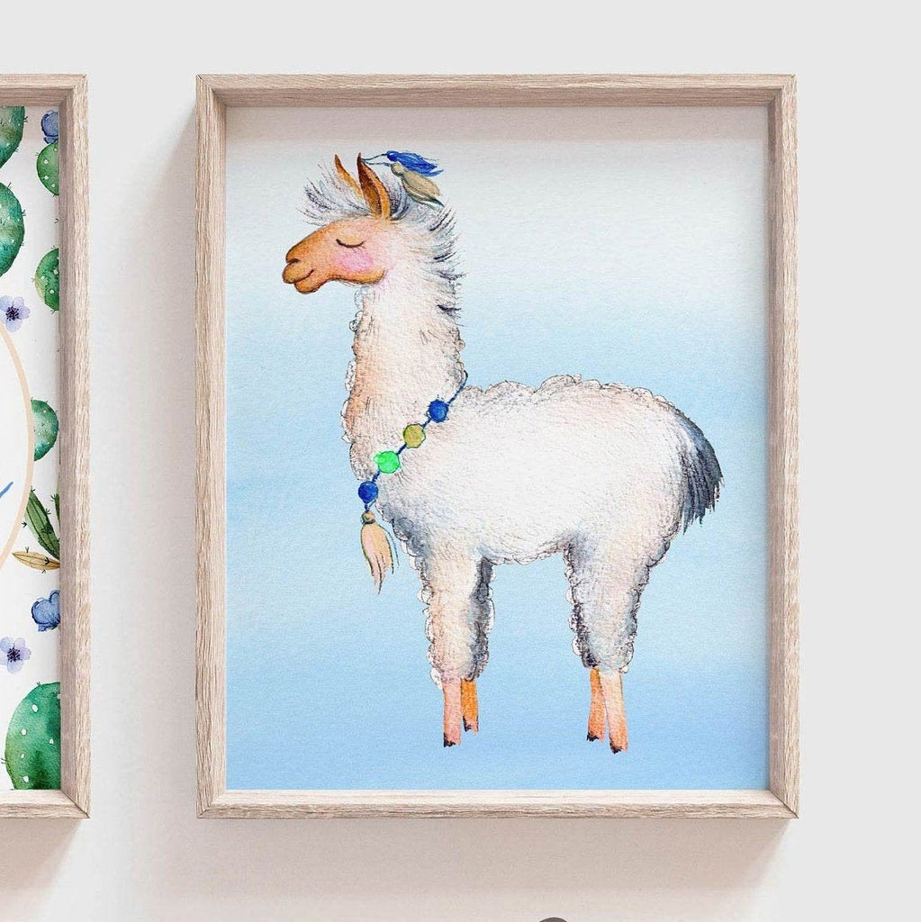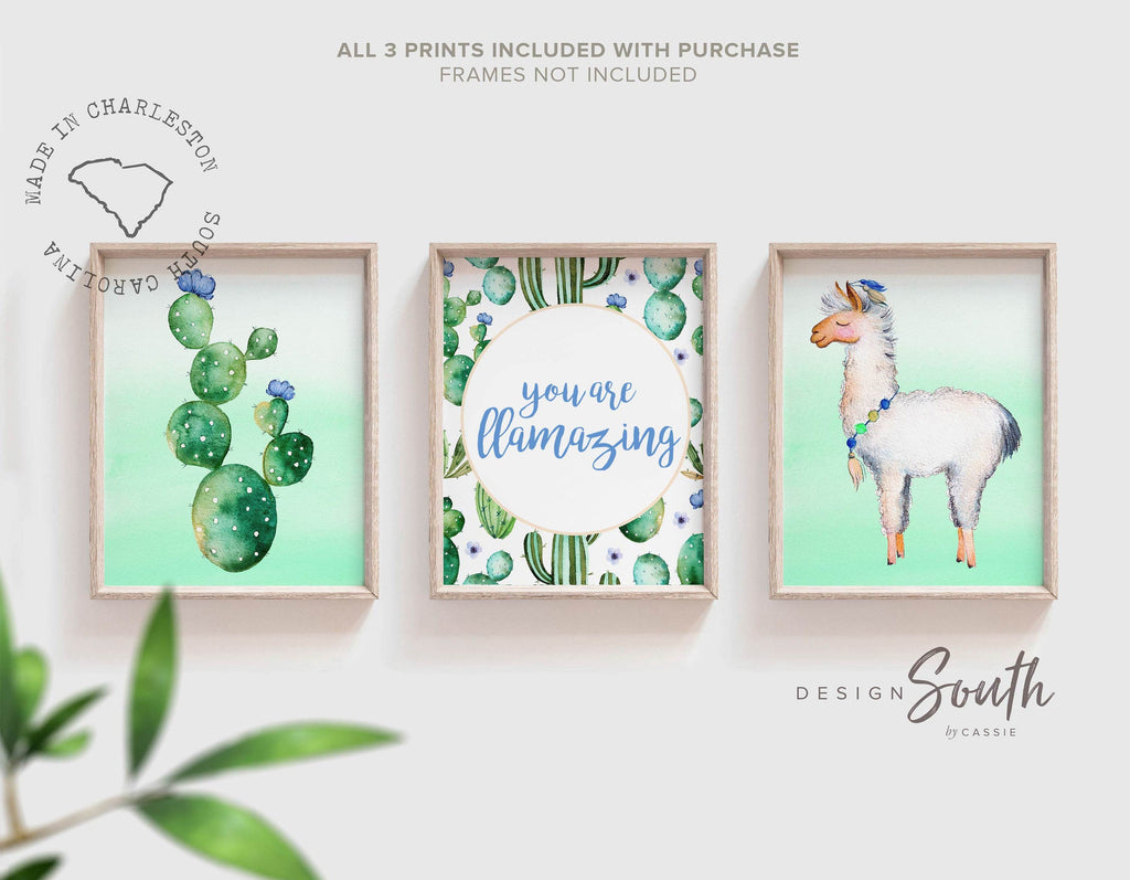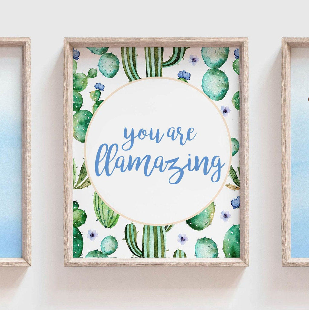 Product description: Boho watercolor prints featuring a llama and cacti with blooming blue flowers and a matching print reading, "You are llamazing." Other options are also available in my shop.