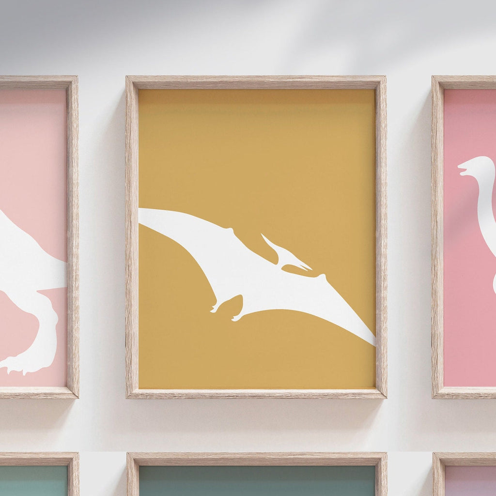 Product description: Art prints featuring dinosaur silhouettes in white with pastel solid colored backgrounds. Other options are also available in my shop.