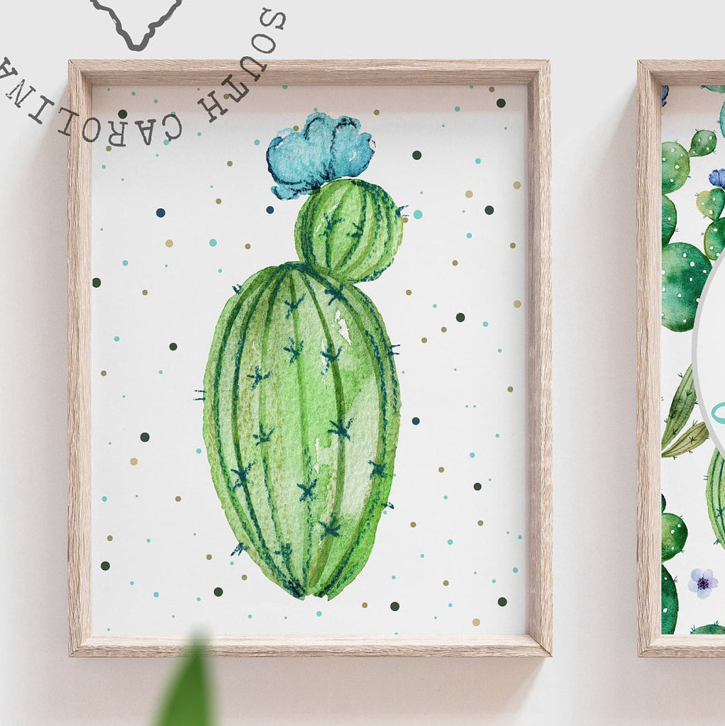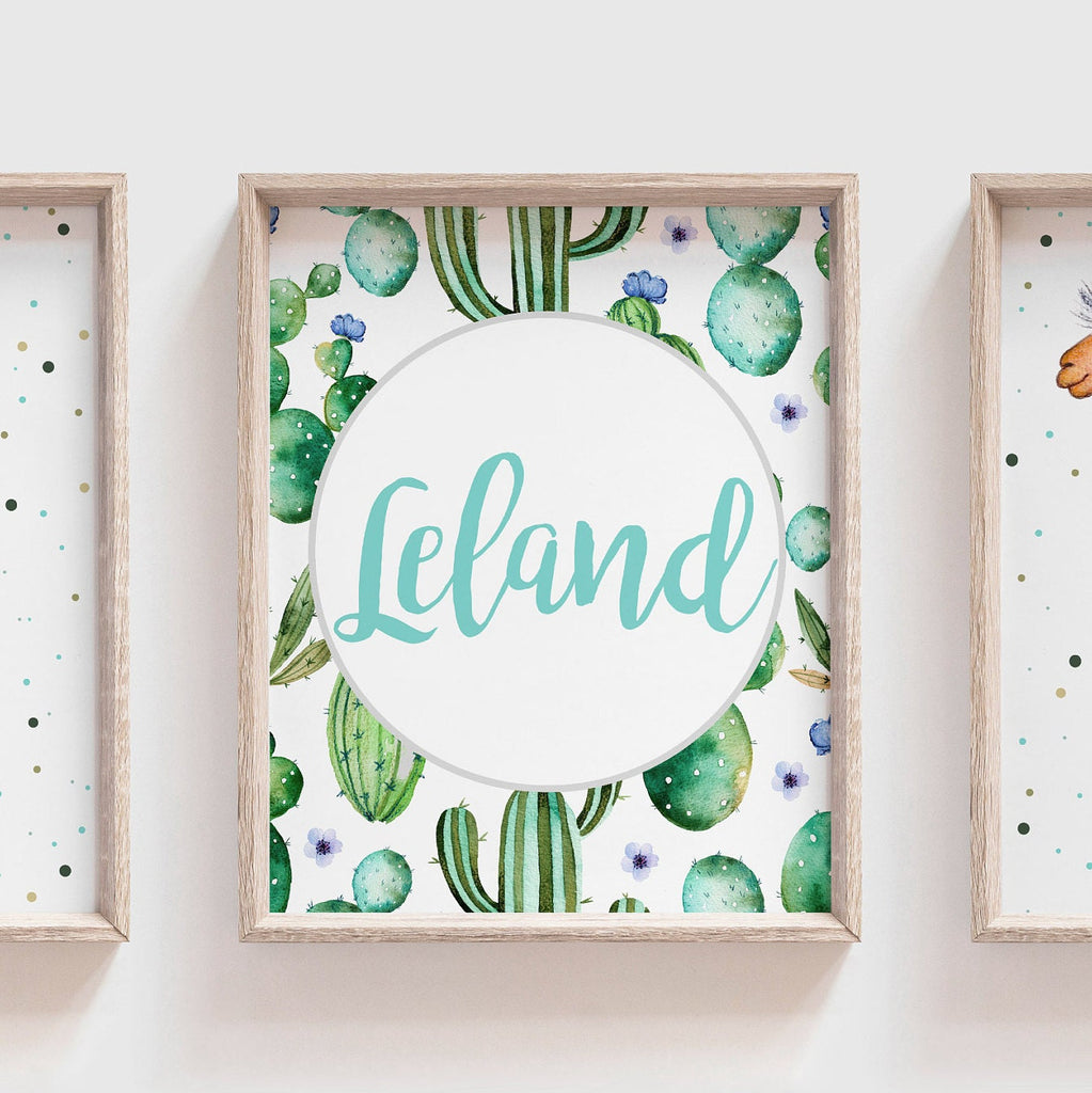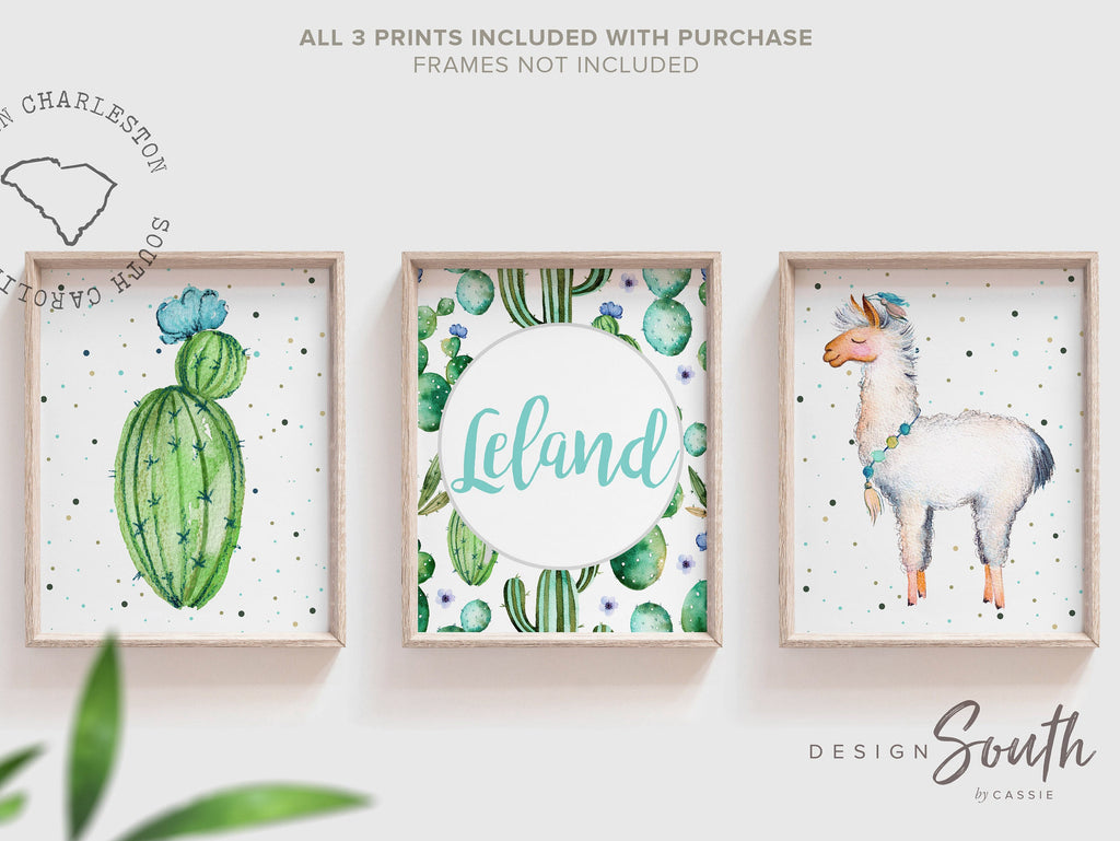 Product description: Desert cactus and llama theme prints in watercolor with bloomed teal and blue flowers and matching monogram print. Other color options are also available.
