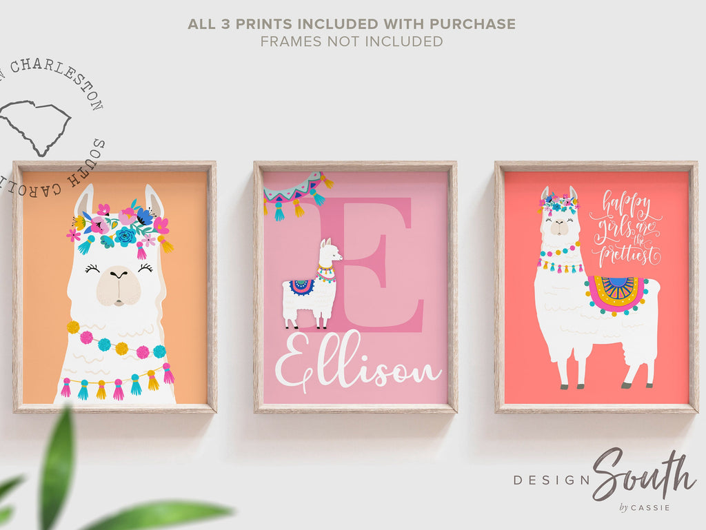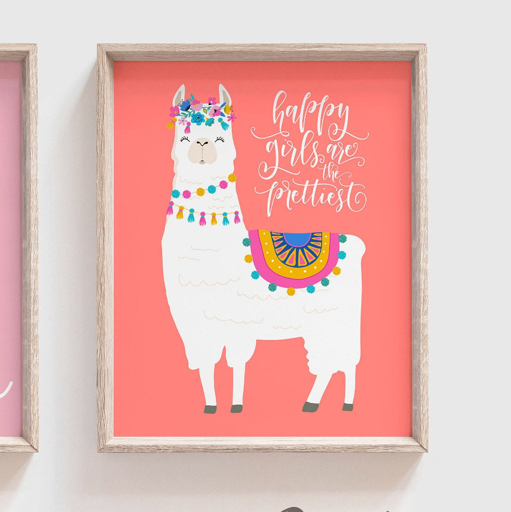 Product description: Bright and colorful llama theme prints with background colors in coral, sorbet and bubblegum. Matching inspirational quote with one of the llamas reading, "Happy girls are the prettiest." Other options are also available in my shop.