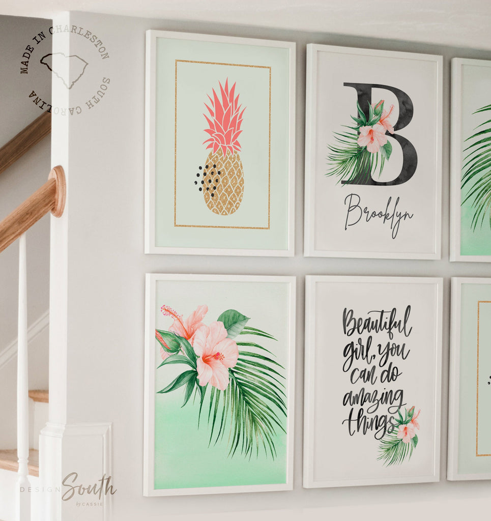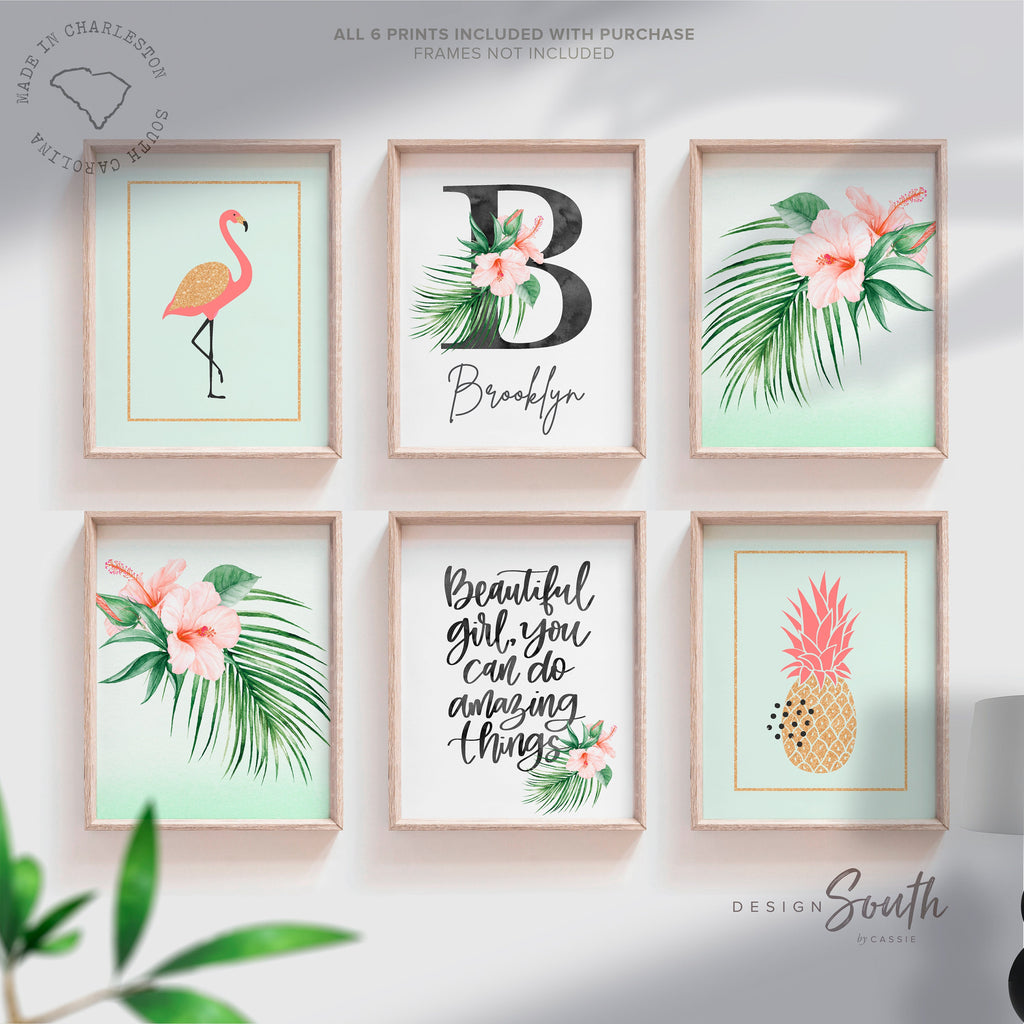 ☛ ☛ ☛ FRAMES ARE NOT INCLUDED ☚ ☚ ☚Thank you for choosing Design South. 🌸I take pride in creating all of my designs. These timeless tropical wall art prints will redefine the walls of a girl's nursery, playroom or bedroom. Each design is curated with a passion and vision to create inspired spaces for you and your little ones.Ready to order THESE prints for your home decor? It’s EASY! Complete check out and include the information below in the ‘notes to seller’ section when ordering. 1. Provide the name for the monogram print.2. Choose the size of your prints. Options: 5x7, 8x10, 11x14. ----------------♥ WHAT YOU WILL RECEIVE ♥-----------------➤ Six UNFRAMED art prints. Product description: Tropical theme prints featuring a flamingo, pineapple, floral palms, personalized monogram and inspirational quote reading, "Beautiful girl, you can do amazing things." Palm backgrounds are using 'Mint' from the textured ombre palette. Other options are also available in my shop.Frames are for decoration purposes and are not included. The prints should be framed behind glass once received. These are not canvas prints. My art is professionally printed on high-quality fine art paper. Each piece is printed as ordered. ---------------------------♥ TIMELINE ♥-----------------------------Timeline: Orders are carefully packaged and typically ready to ship within 3-5 business days. See my shop website for updated turnaround times. If you would like a custom order, visit my shop website and send me a message. Note: Custom orders will require a proof sent to you via email and confirmation regarding the proof for your order to be mailed. **Each day that we do not receive information such as your child's name, or an approval of the proof, it will delay the shipping date. -----------------------♥ TERMS OF USE ♥-------------------------Product cannot be reproduced, resold or distributed. The artwork in this shop is the property of Design South. The artwork offered here is for personal use only.Thanks for choosing Design South! - Cassie DESIGN SOUTH© COPYRIGHT 2022 / Design South / Cassie Rinehart