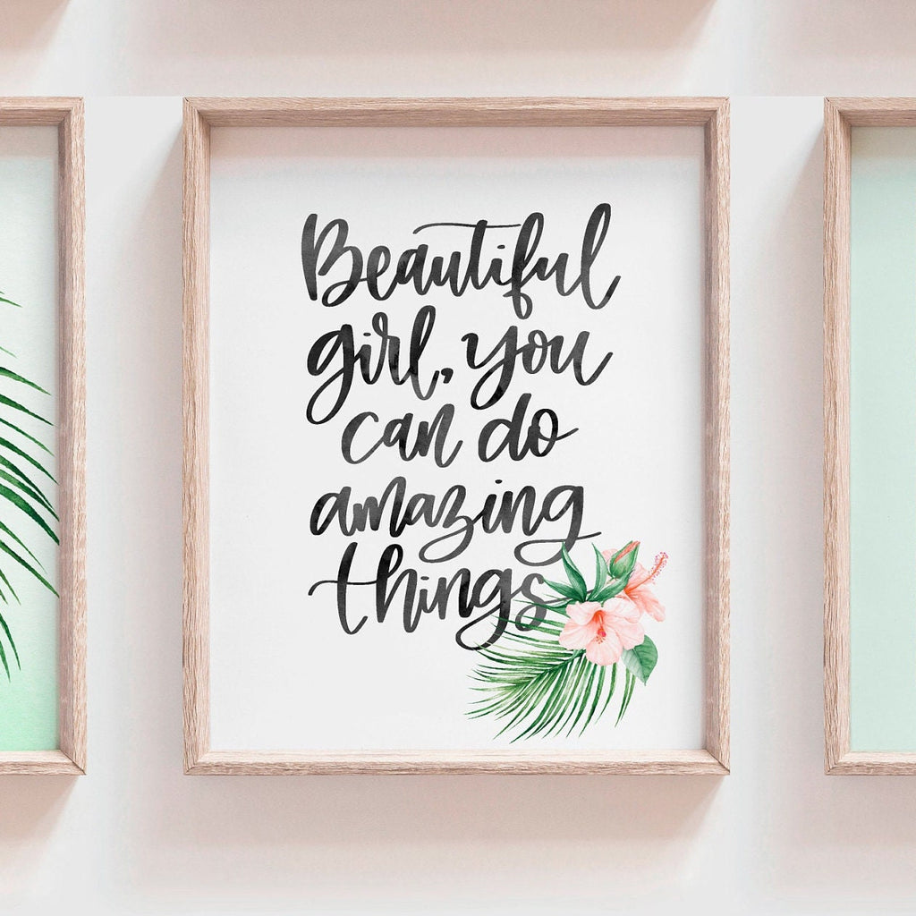 Mint green and coral nursery, mint gold coral girl's room wall art, little girl tropical decor, beautiful girl you can do amazing things art