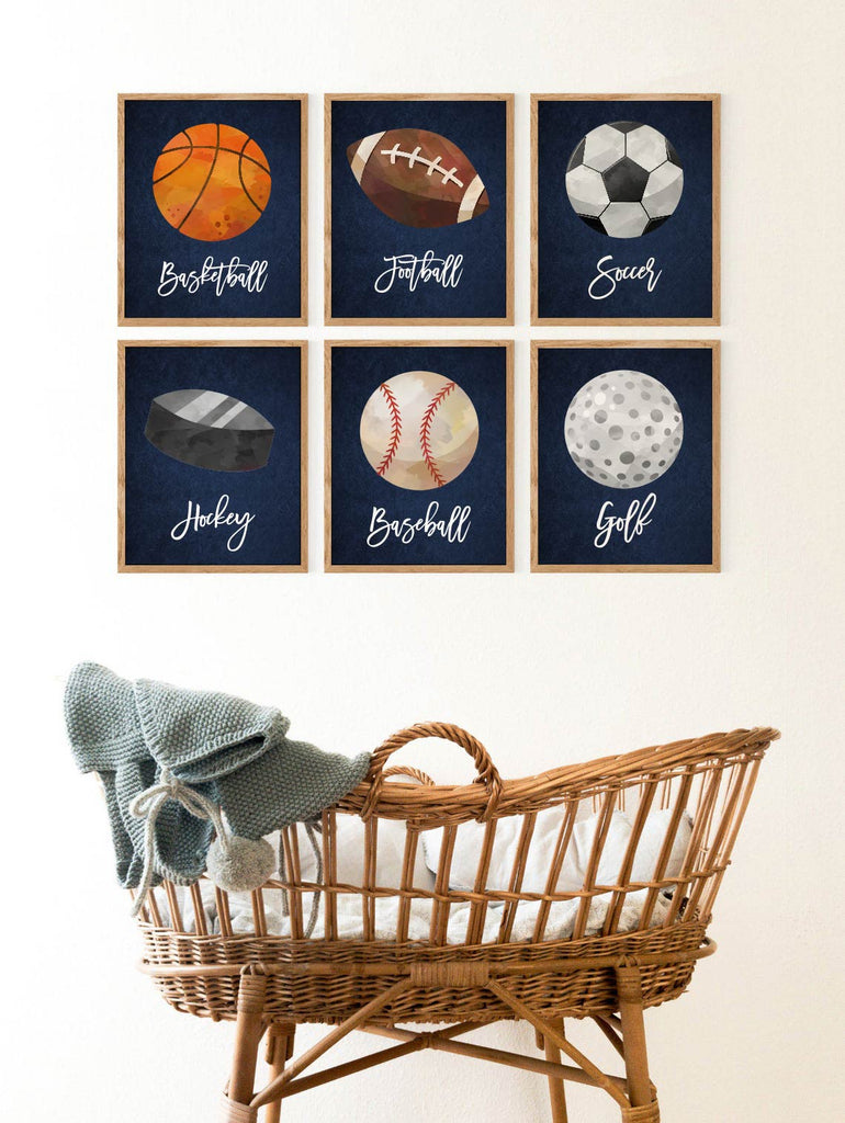 Product description: Sports theme watercolor prints including a basketball, football, soccer ball, hockey puck, baseball and a golf ball with navy blue realistic textured backgrounds. You may request to swap out any of the sports with softball, tennis, bowling or volleyball. Please specify in the 'notes to seller' section during checkout. Other options are also available in my shop.