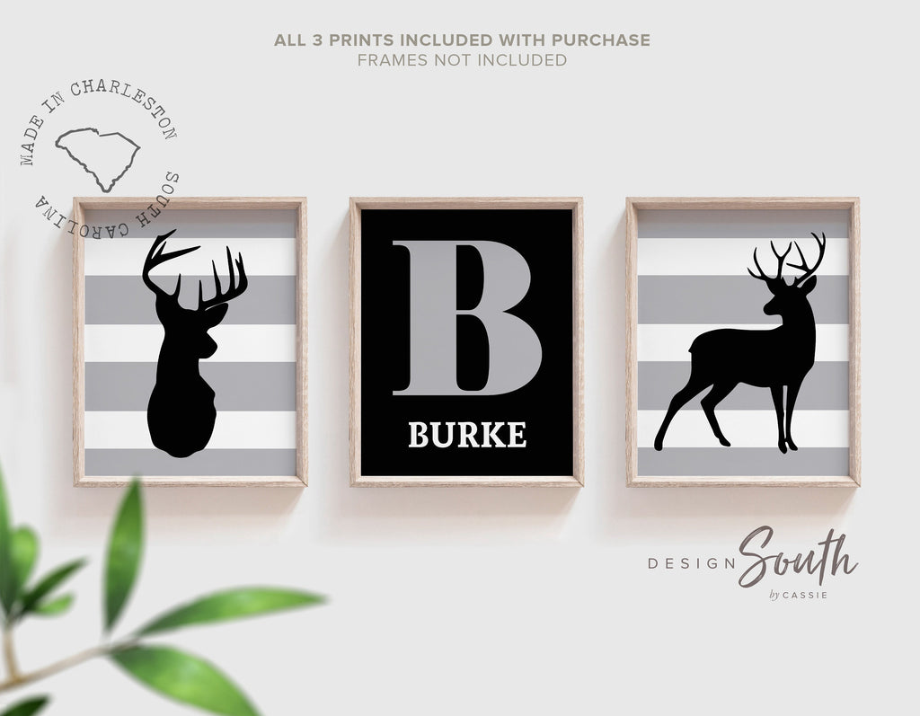 ☛ ☛ ☛ FRAMES ARE NOT INCLUDED ☚ ☚ ☚Thank you for choosing Design South. I take pride in creating all of my designs. These wall prints are perfect for a nursery, bedroom, playroom, or child's bathroom.Product description: Buck deer prints in black with thick smoke and white striped backgrounds. Center print is personalized with your child's name and initial. Colors can be customized to suit your needs.What you will receive: Three UNFRAMED art prints.A color change is included in the price. Frames are for decoration purposes and are not included. The prints should be framed behind glass once received. These are not canvas prints. See information needed in the ‘notes to seller’ section. My art is professionally printed on high-quality fine art paper. Each piece is printed as ordered.Complete check out and include the information below in the ‘notes to seller’ section when ordering. 1. Indicate if you would like the prints as shown OR if you would like a color change. If you do not indicate a color change, Design South will assume that you would like the prints in the colors shown above. **NOTE: Please leave a message in the 'notes to seller' section during checkout with your color choice from the chart above if you are requesting colors that are different from this listing. If you do not see the color(s) you want, send me a message! I also accept pictures of nurseries, bedding, and decor for color matching. In the case of a COLOR CHANGE, I will send you a PROOF to your email account. I will use the email account associated with your Etsy account, unless otherwise noted. Please VERIFY the proof, so that I can print and ship your order. Waiting to verify your proof will delay shipping. 2. Your child's name that you want on the print.3. Choose the size of your prints. Options: 5x7, 8x10, 11x14. Timeline: Orders are carefully packaged and typically ready to ship within 3-5 business days. See my shop website for updated turnaround times. If you would like a custom order, visit my shop website and send me a message. Note: Custom orders will require a proof sent to you via email and confirmation regarding the proof for your order to be mailed. Shop website: https://www.etsy.com/shop/DesignSouthChsTerms of Use: Product cannot be reproduced, resold or distributed.