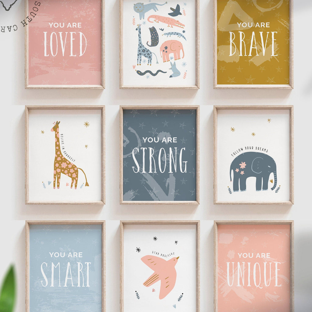 Product description: Inspirational animal themed prints with inspirational sayings reading, "You are kind. You are brave. You are strong. You are loved. You are unique." Other options are also available in my shop.